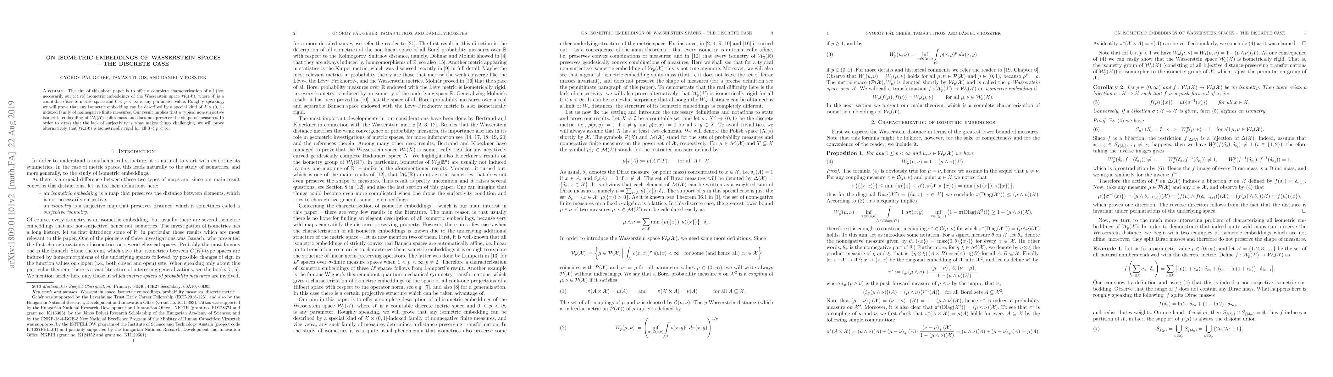 This paper characterizes isometric embeddings of the Wasserstein space $\mathcal{W}_p(\mathcal{X})$ for discrete metric spaces, showing that non-surjective embeddings split mass and lack shape preservation. It also proves that $\mathcal{W}_p(\mathcal{X})$ is isometrically rigid for all $0<p<\infty$.