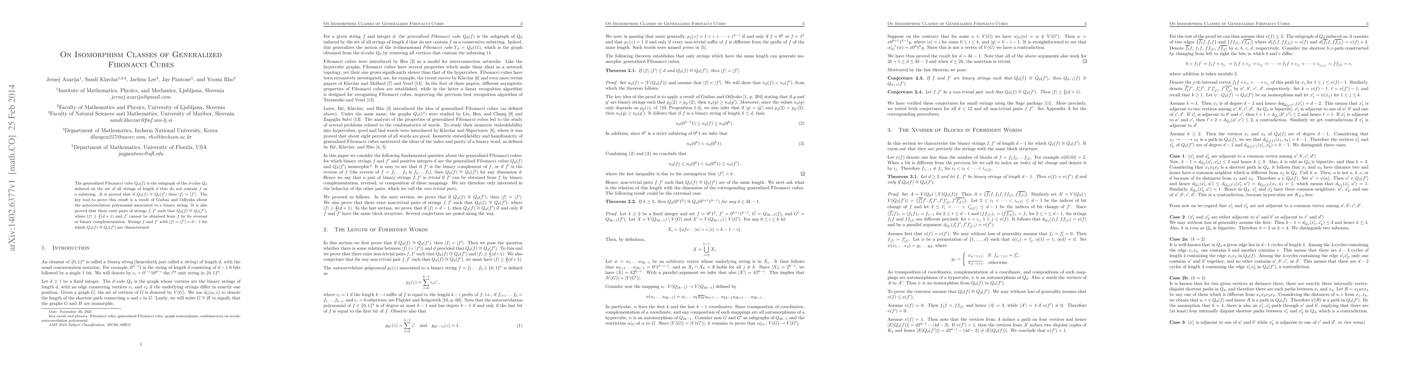 The generalized Fibonacci cube $Q_d(f)$ is the subgraph of the $d$-cube $Q_d$ induced on the set of all strings of length $d$ that do not contain $f$ as a substring. It is proved that if $Q_d(f) \cong Q_d(f')$ then $|f|=|f'|$. The key tool to prove this result is a result of Guibas and Odlyzko about the autocorrelation polynomial associated to a binary string. It is also proved that there exist pairs of strings $f, f'$ such that $Q_d(f) \cong Q_d(f')$, where $|f| \ge \frac{2}{3}(d+1)$ and $f'$ cannot be obtained from $f$ by its reversal or binary complementation. Strings $f$ and $f'$ with $|f|=|f'|=d-1$ for which $Q_d(f) \cong Q_d(f')$ are characterized.