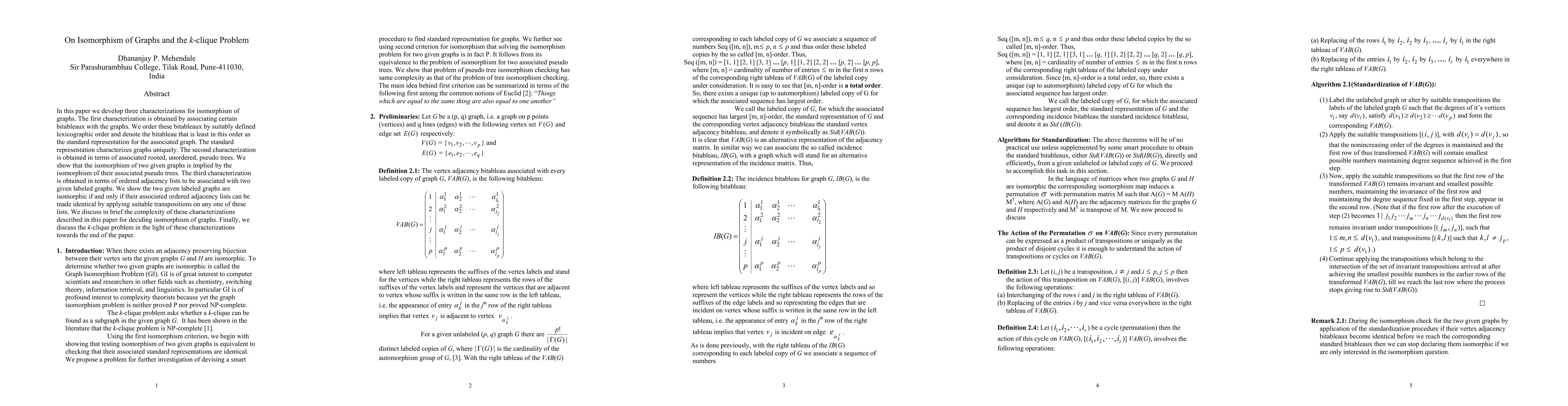 In this paper we develop three characterizations for isomorphism of graphs. The first characterization is obtained by associating certain bitableaux with the graphs. We order these bitableaux by suitably defined lexicographic order and denote the bitableau that is least in this order as the standard representation for the associated graph. The standard representation characterizes graphs uniquely. The second characterization is obtained in terms of associated rooted, unordered, pseudo trees. We show that the isomorphism of two given graphs is implied by the isomorphism of their associated pseudo trees. The third characterization is obtained in terms of ordered adjacency lists to be associated with two given labeled graphs. We show the two given labeled graphs are isomorphic if and only if their associated ordered adjacency lists can be made identical by the action of suitable transpositions on any one of these lists. We discuss in brief the complexity of these characterizations described in this paper for deciding isomorphism of graphs. Finally, we discuss the k-clique problem in the light of these characterizations towards the end of the paper.