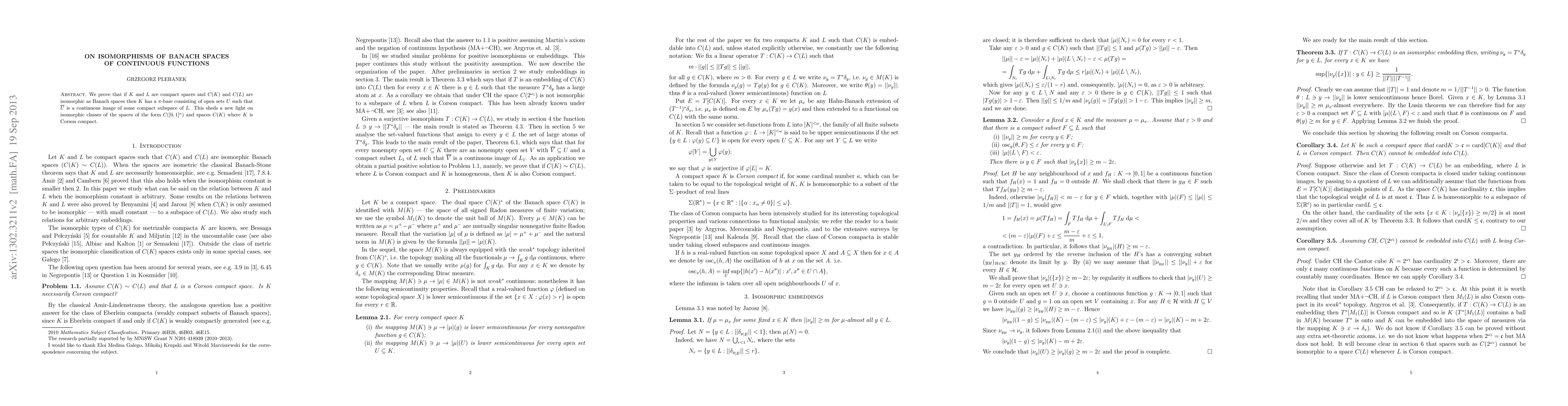 Researchers prove that if two compact spaces have isomorphic spaces of continuous functions, one space has a specific type of base for its topology, relating to Corson compactness.