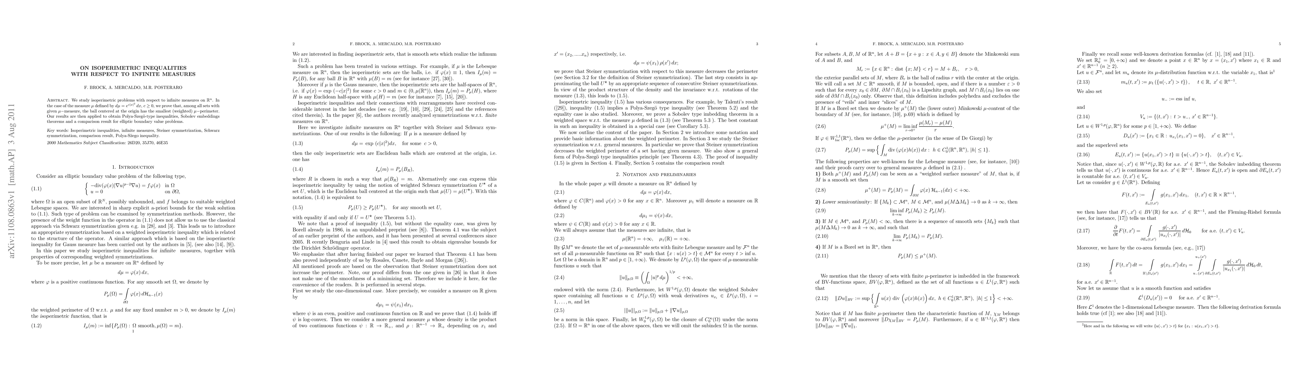 This paper investigates isoperimetric inequalities concerning infinite measures on $R^n$, proving that for the measure $\mu$ defined by $d\mu = e^{c|x|^2} dx$, the ball centered at the origin minimizes the weighted $\mu-$perimeter. The findings are applied to derive Polya-Szego-type inequalities, Sobolev embeddings, and a comparison result for elliptic boundary value problems.