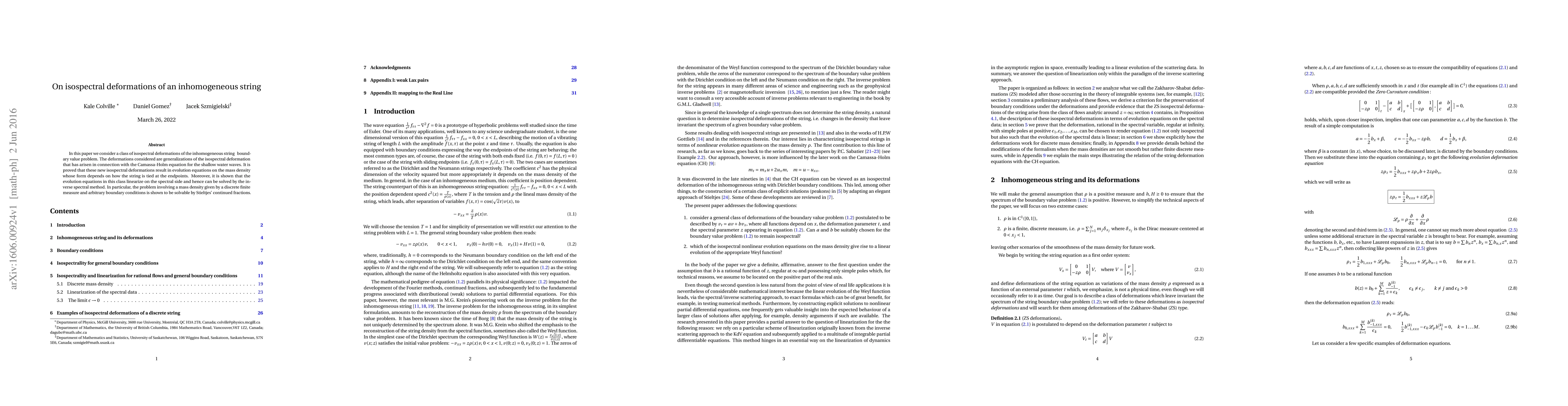 The research explores isospectral deformations of an inhomogeneous string, generalizing deformations related to the Camassa-Holm equation for shallow water waves. It proves that these deformations lead to evolution equations on mass density, dependent on how the string is tied at the endpoints, and shows that these equations linearize on the spectral side, solvable via inverse spectral methods.