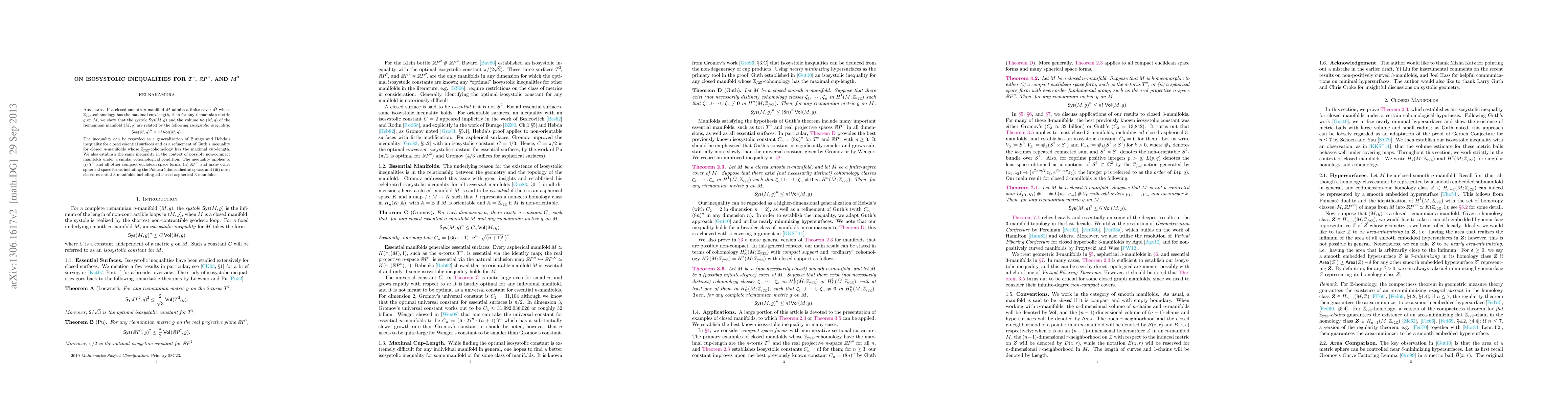 This paper establishes an isosystolic inequality relating the systole and volume of n-manifolds with maximal cohomological cup-length under a Riemannian metric, generalizing previous results for surfaces and n-manifolds. The inequality applies to compact Euclidean space forms, spherical space forms, and most closed essential 3-manifolds.