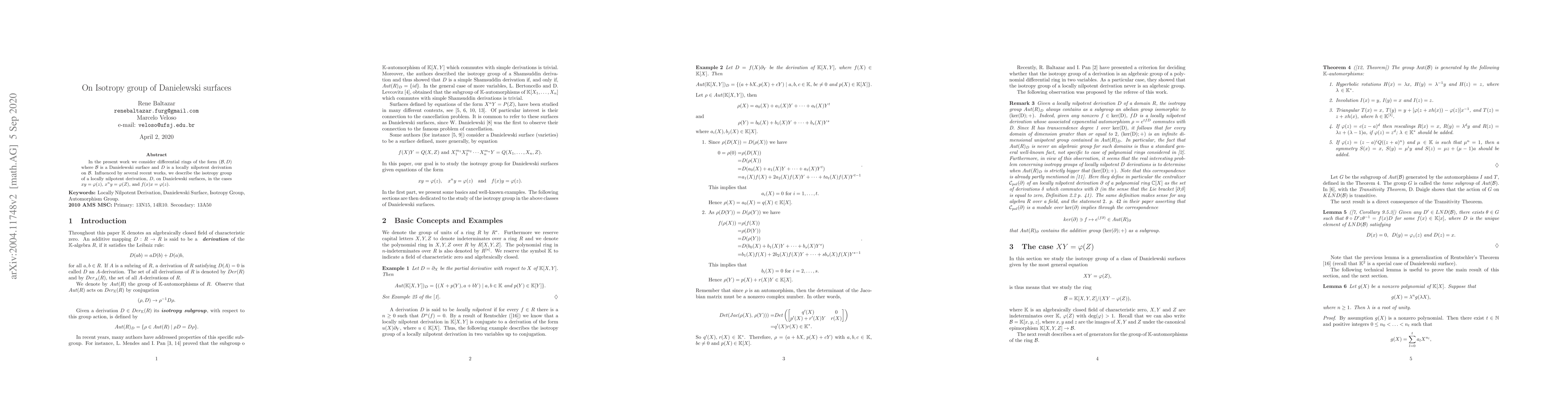 This paper investigates the isotropy group of locally nilpotent derivations on Danielewski surfaces, focusing on three specific forms: $xy = \varphi(z)$, $x^ny=\varphi(Z)$, and $f(x)x = \varphi(z)$. It aims to describe the structure of these derivations within the differential ring $(\mathcal B,D)$.