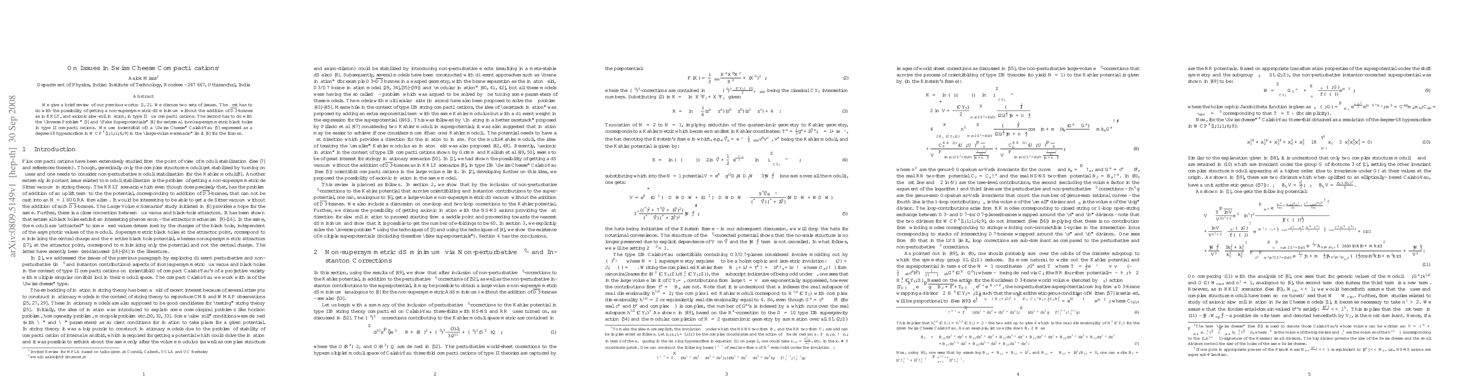 This paper reviews previous works on Swiss Cheese compactifications, focusing on achieving non-supersymmetric de Sitter minima without anti-D3 branes and exploring axionic slow-roll inflation in type II flux compactifications. It also addresses the "Inverse Problem" and "Fake Superpotentials" for extremal (non)supersymmetric black holes, utilizing a degree-18 hypersurface in WCP^4 for analysis.