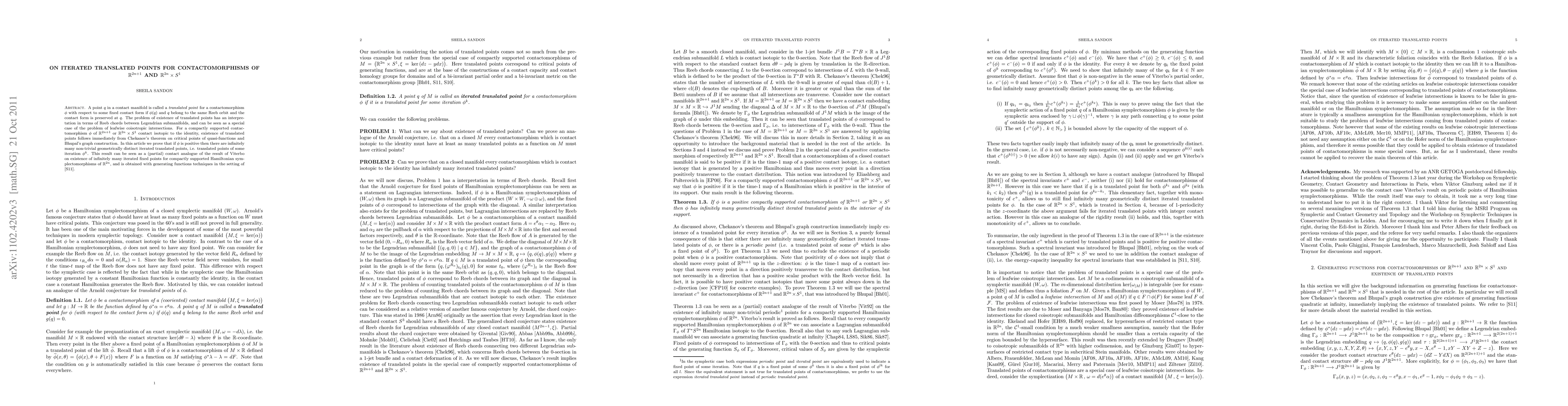 This paper investigates translated points for contactomorphisms in contact manifolds, proving the existence of infinitely many non-trivial geometrically distinct iterated translated points for positive contactomorphisms. This result parallels Viterbo's theorem on iterated fixed points for Hamiltonian symplectomorphisms.