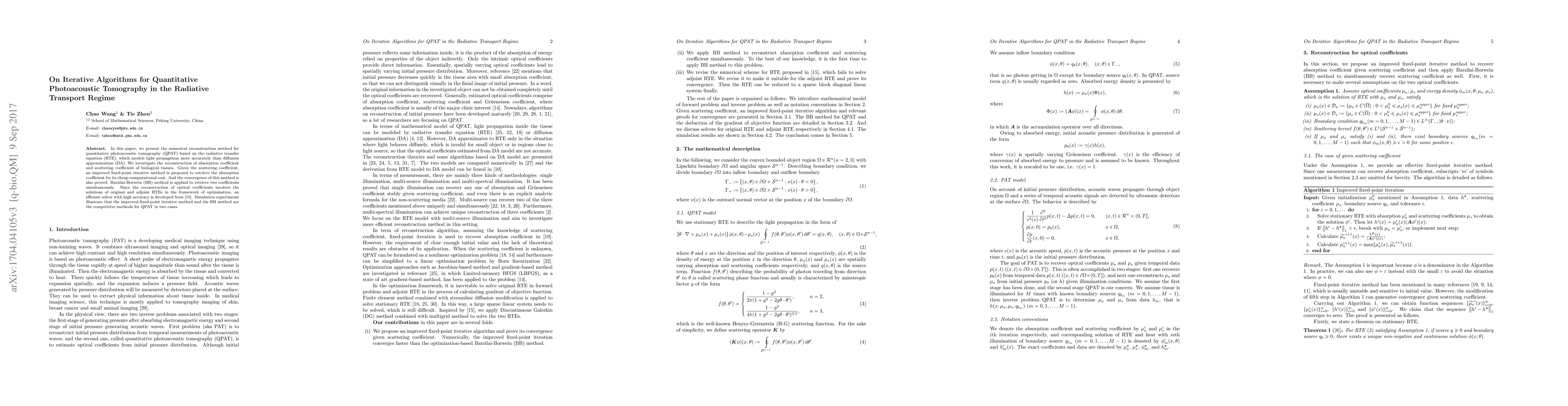 In this paper, we describe the numerical reconstruction method for quantitative photoacoustic tomography (QPAT) based on the radiative transfer equation (RTE), which models light propagation more accurately than diffusion approximation (DA). We investigate the reconstruction of absorption coefficient and/or scattering coefficient of biological tissues. Given the scattering coefficient, an improved fixed-point iterative method is proposed to retrieve the absorption coefficient for its cheap computational cost. And we prove the convergence. To retrieve two coefficients simultaneously, Barzilai-Borwein (BB) method is applied. Since the reconstruction of optical coefficients involves the solution of original and adjoint RTEs in the framework of optimization, an efficient solver with high accuracy is improved from~\cite{Gao}. Simulation experiments illustrate that the improved fixed-point iterative method and the BB method are the comparative methods for QPAT in two cases.