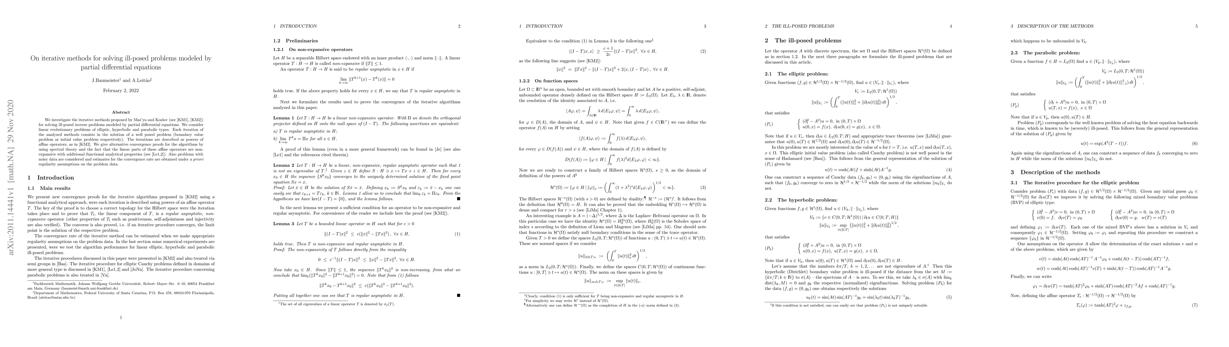 This paper examines iterative methods by Maz'ya and Kozlov for solving ill-posed inverse problems governed by PDEs, proving convergence using spectral theory and functional analysis, and providing estimates for convergence rates under data regularity assumptions. The methods iteratively solve well-posed problems within affine operator frameworks.