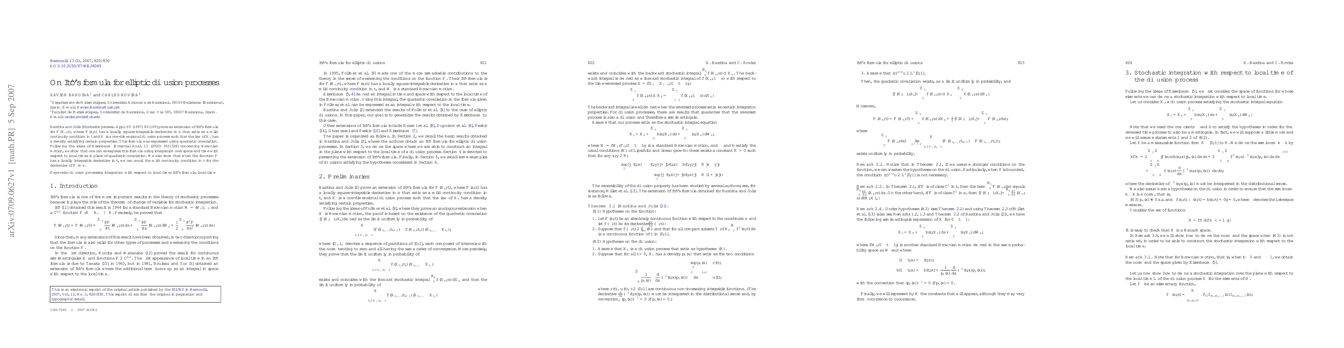 The paper generalizes It ext{o}'s formula for elliptic diffusion processes, expressing it using integration over space and time with respect to local times instead of quadratic covariation, allowing for a weaker continuity condition on the derivative of F in t.