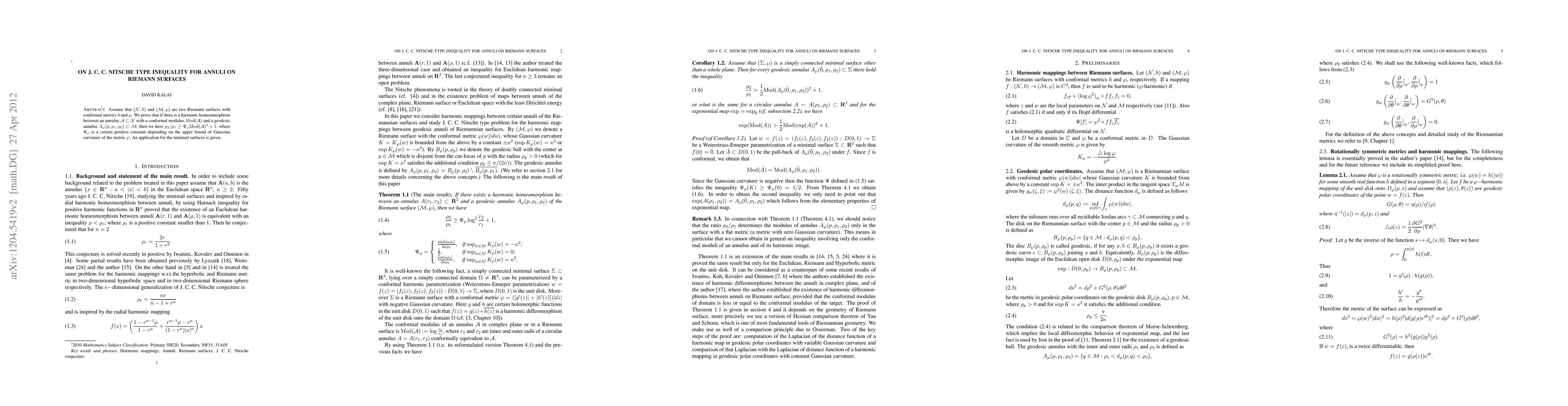 This paper proves an inequality for harmonic homeomorphisms between annuli on Riemann surfaces with conformal metrics, establishing a lower bound on the ratio of radii involving the modulus of the annulus and Gaussian curvature. The result has implications for minimal surfaces.