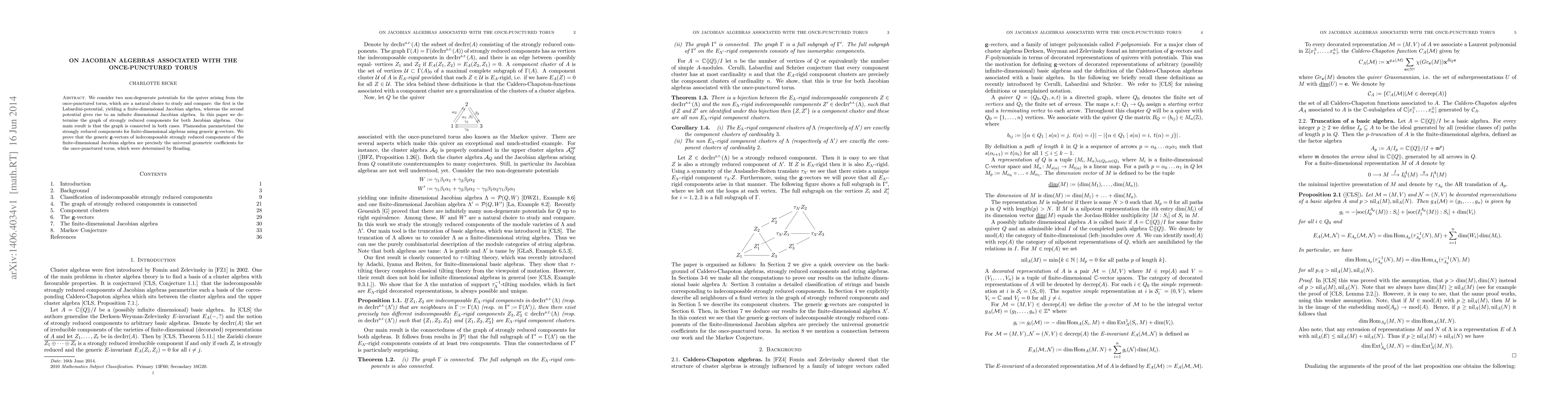 This paper examines Jacobian algebras derived from two potentials associated with a once-punctured torus, comparing a finite-dimensional algebra from the Labardini-potential and an infinite-dimensional algebra from another potential. The main result is that the graph of strongly reduced components is connected for both algebras, with the finite-dimensional case's generic g-vectors corresponding to universal geometric coefficients for the torus.