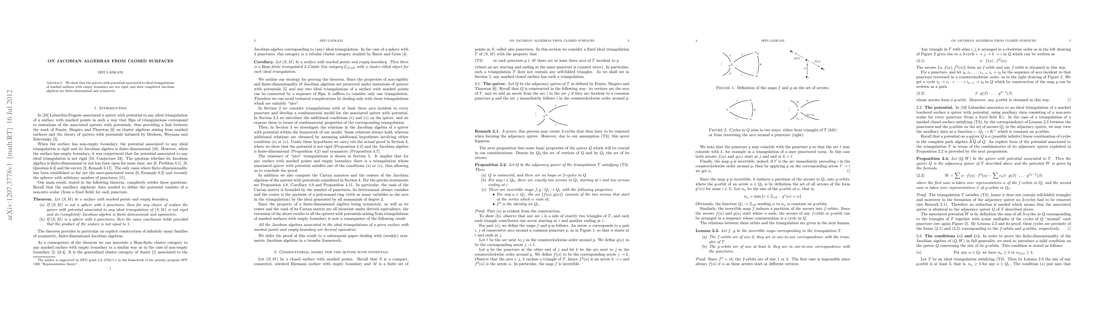 Summary: The paper demonstrates that quivers with potentials from ideal triangulations of closed marked surfaces are non-rigid, yet their completed Jacobian algebras are finite-dimensional and symmetric.