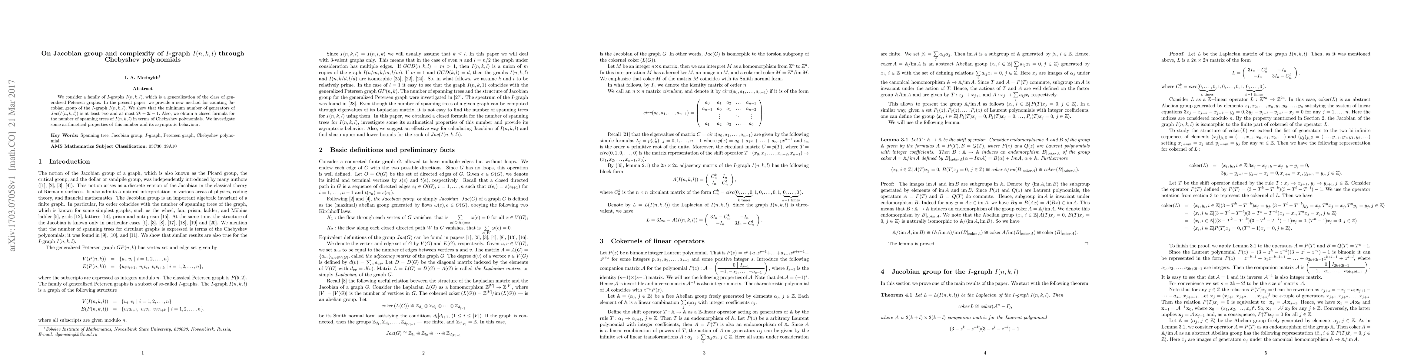 We consider a family of I-graphs I(n,k,l), which is a generalization of the class of generalized Petersen graphs. In the present paper, we provide a new method for counting Jacobian group of the I-graph I(n,k,l). We show that the minimum number of generators of Jac(I(n,k,l)) is at least two and at most 2k + 2l - 1. Also, we obtain a closed formula for the number of spanning trees of I(n,k,l) in terms of Chebyshev polynomials. We investigate some arithmetical properties of this number and its asymptotic behaviour.