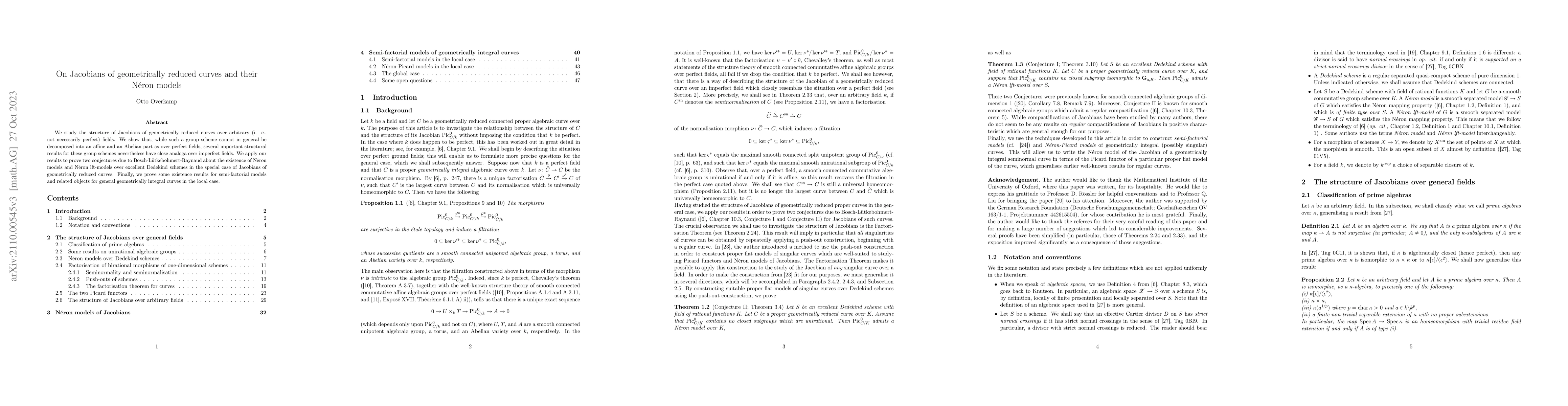 This paper investigates the structure of Jacobians of geometrically reduced curves over non-perfect fields, demonstrating that while they cannot always be decomposed into affine and Abelian parts, analogous structural results still hold. The study proves conjectures regarding the existence of Néron models for these Jacobians and provides existence results for semi-factorial models for general geometrically integral curves.