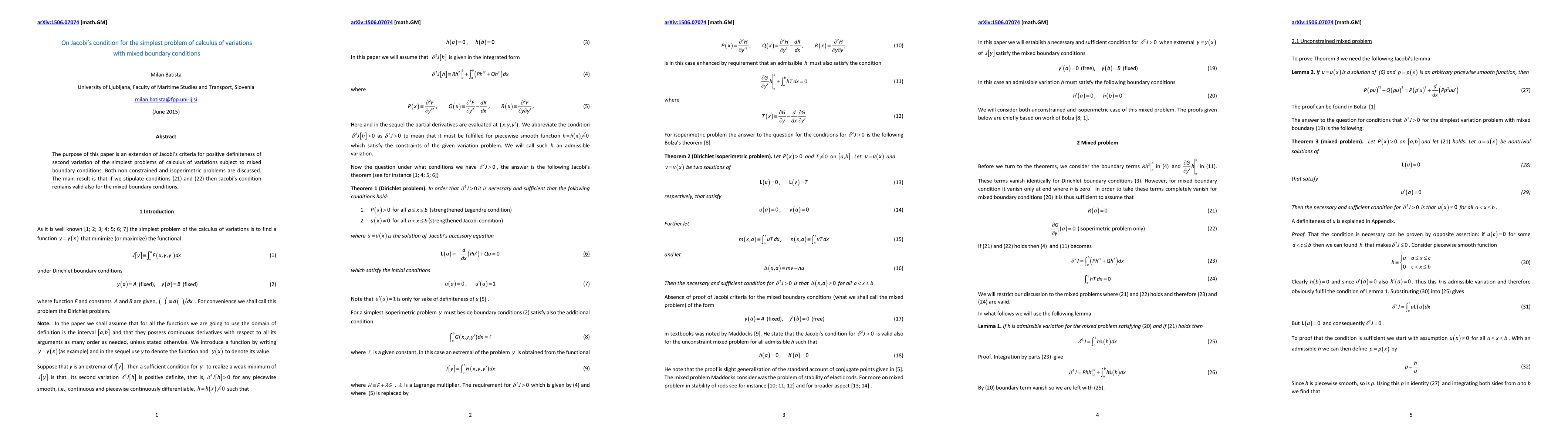 The purpose of this paper is the extension of Jacobi's criteria for positive definiteness of second variation of the simplest problems of calculus of variations subject to mixed boundary conditions. Both non constrained and isoperimetric problems are discussed. The main result is that Jacobi's condition remains valid also for the mixed boundary conditions.