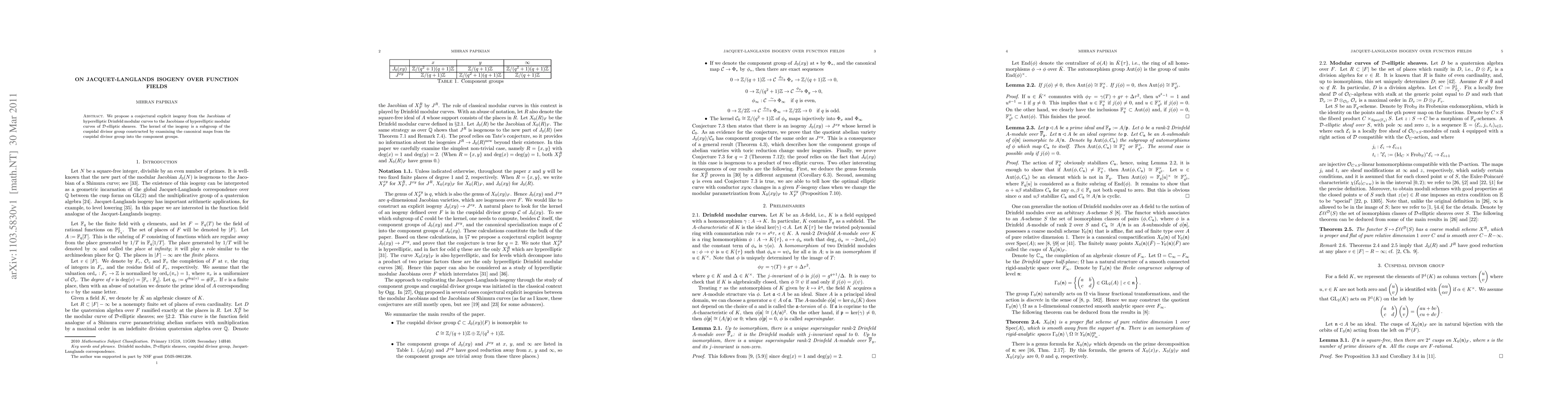 We propose a conjectural explicit isogeny from the Jacobians of hyperelliptic Drinfeld modular curves to the Jacobians of hyperelliptic modular curves of $\mathcal{D}$-elliptic sheaves. The kernel of the isogeny is a subgroup of the cuspidal divisor group constructed by examining the canonical maps from the cuspidal divisor group into the component groups.