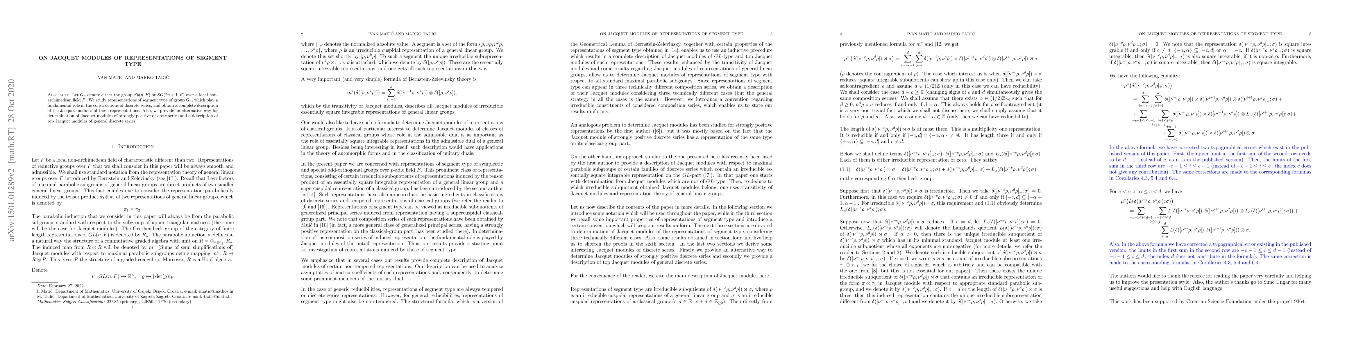 We study representations of segment type of groups Sp(n) and SO(2n+1, F) over a local non-archimedean field, which play a fundamental role in the constructions of discrete series, and obtain a complete description of the Jacquet modules of these representations. Also, we provide an alternative way for determination of Jacquet modules of strongly positive discrete series and a description of top Jacquet modules of general discrete series. In this version are corrected few typographical errors which exist in the published version of this paper (see page 5 of the paper for more details).