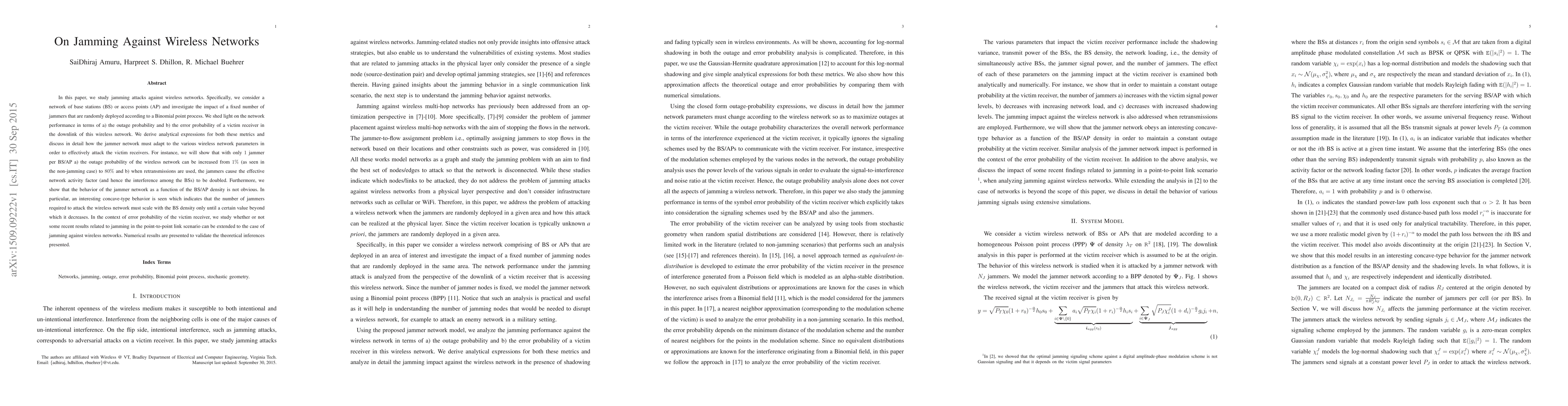 This research examines jamming attacks on wireless networks, revealing that a small number of jammers can significantly degrade network performance, increasing outage probability and effectively doubling interference. The study also uncovers a counterintuitive relationship between jammer deployment and base station density, showing that the optimal jammer count initially increases with density but then decreases, and explores the applicability of point-to-point jamming results to network scenarios, supported by numerical validation.