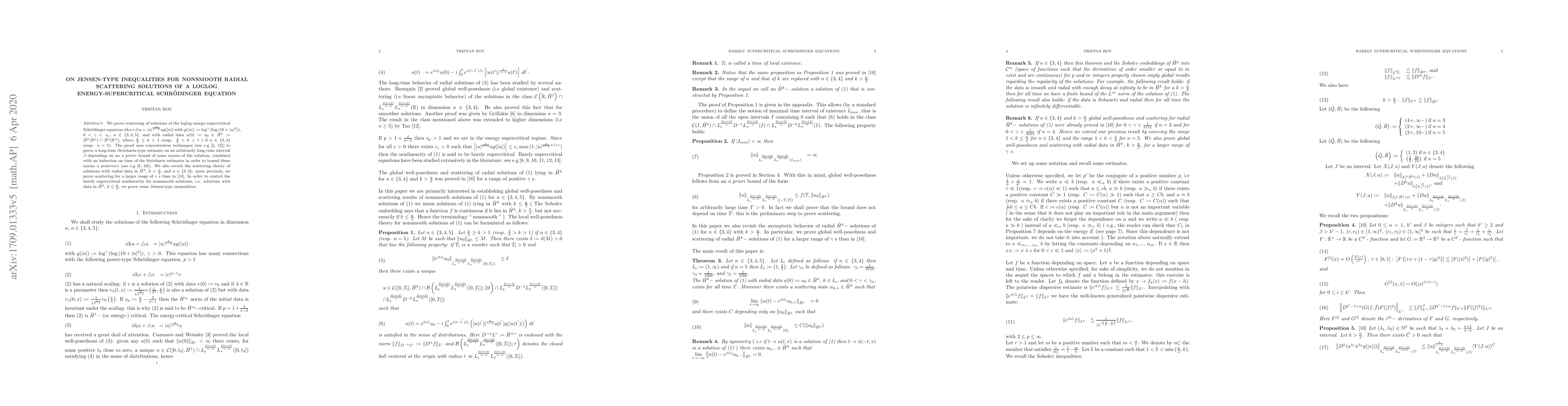 The paper proves scattering of radial solutions for a loglog energy-supercritical Schrödinger equation in dimensions 3 and 4 (or 5) for specific ranges of $k$ and $n$. Jensen-type inequalities are established to control nonlinearities for nonsmooth solutions with data in $ ilde{H}^{k}$, where $k leq n/2$.