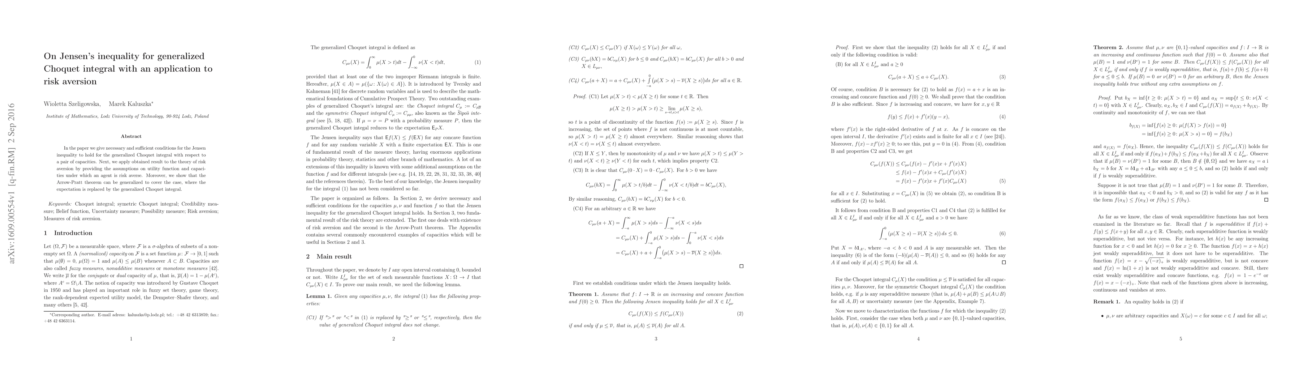 Summary: This paper establishes necessary and sufficient conditions for Jensen's inequality to apply to the generalized Choquet integral concerning a pair of capacities, and extends the Arrow-Pratt theorem to incorporate risk aversion under these conditions.