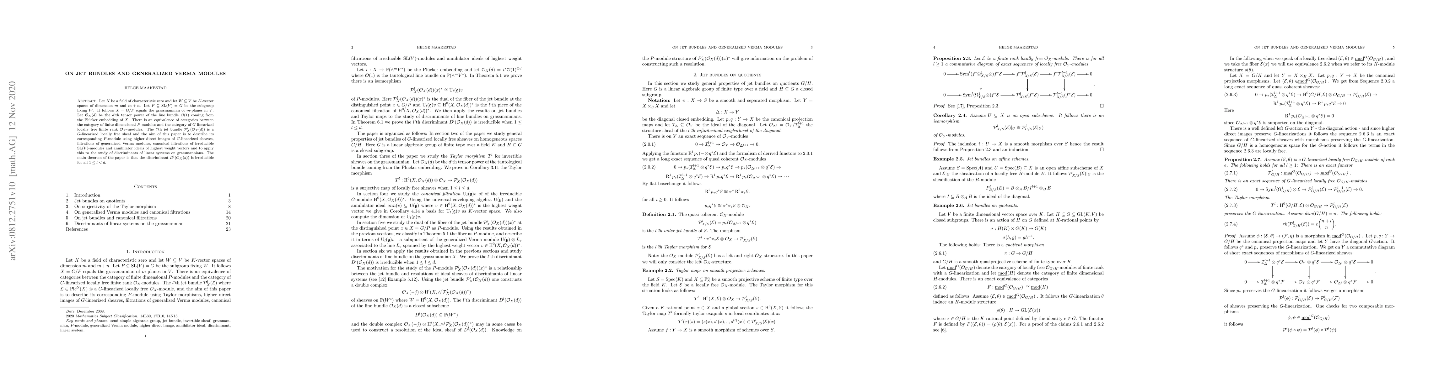 The aim of this paper is to initiate a study of the jet bundles on the grassmannian $X$ over a field of characteristic zero using higher direct images of $G$-linearized sheaves, Lie theoretic methods, enveloping algebra theoretic methods and generalized Verma modules. We calculate the $P$-module of the dual jet bundle $J^l(L)^*$ and prove it equals the $l$'th piece of the canonical filtration for $H^0(X,L)^*$. We use the results obtained to prove the discriminant of any linear system on any grassmannian is irreducible.