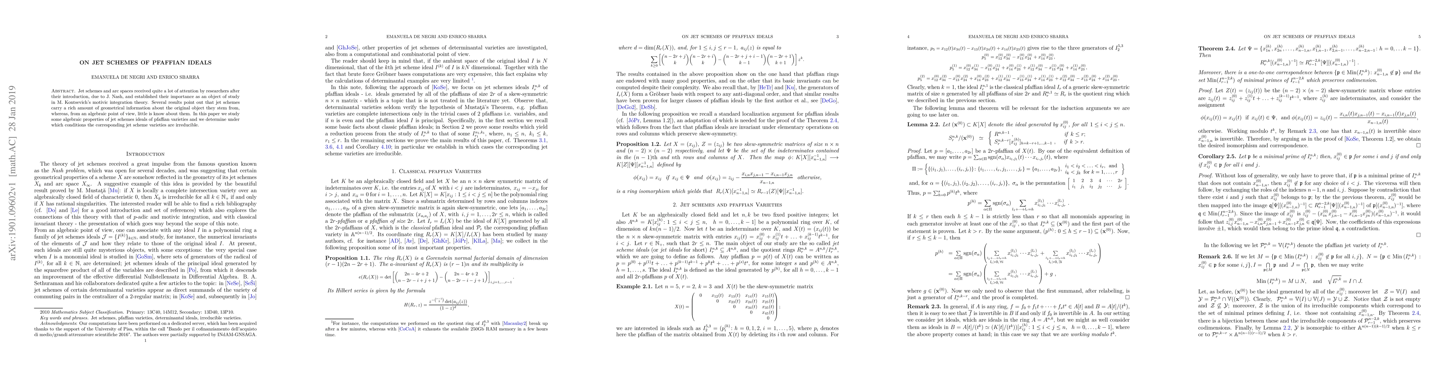 The paper presents detailed algebraic analysis of jet schemes of pfaffian ideals, providing conditions for irreducibility and establishing isomorphisms between relevant rings.