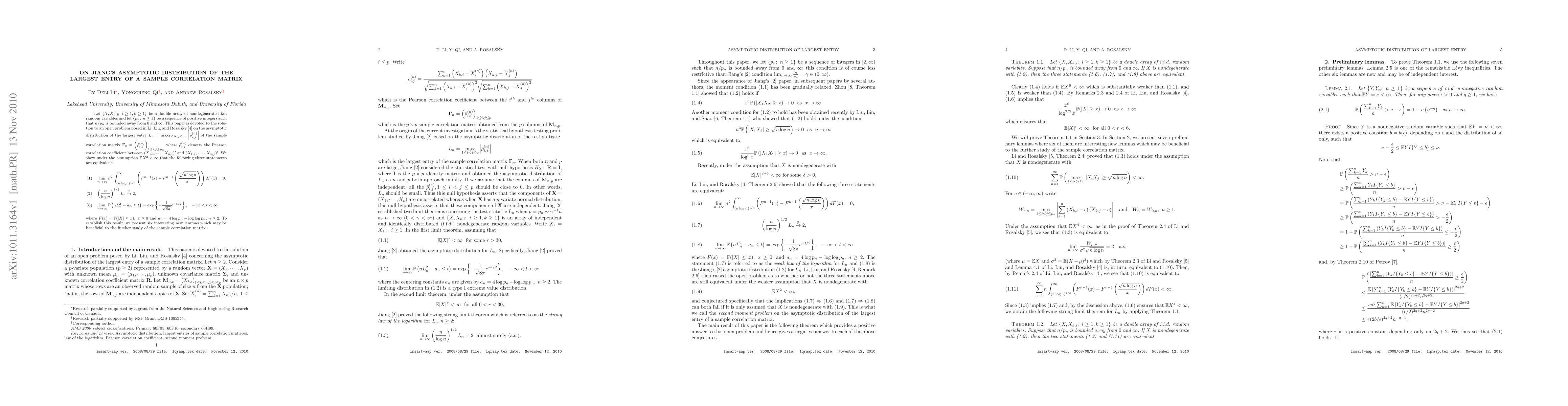 This research paper investigates the asymptotic distribution of the largest entry in a sample correlation matrix under certain conditions, establishing three equivalent statements regarding its behavior as sample size approaches infinity.