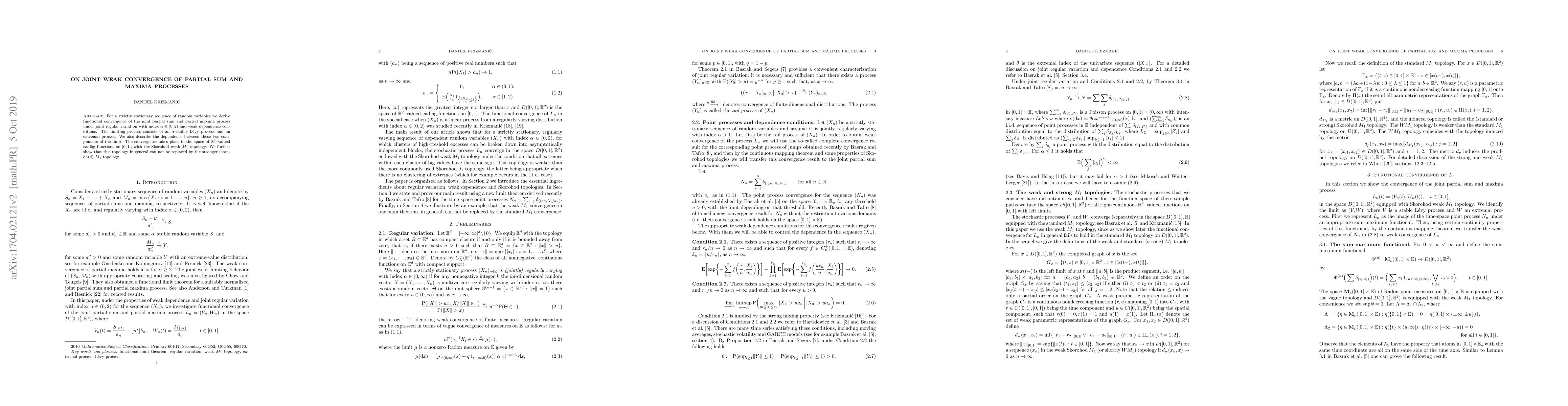 For a strictly stationary sequence of random variables we derive functional convergence of the joint partial sum and partial maxima process under joint regular variation with index $\alpha \in (0,2)$ and weak dependence conditions. The limiting process consists of an $\alpha$--stable L\'{e}vy process and an extremal process. We also describe the dependence between these two components of the limit. The convergence takes place in the space of $\mathbb{R}^{2}$--valued c\`{a}dl\`{a}g functions on $[0,1]$, with the Skorohod weak $M_{1}$ topology. We further show that this topology in general can not be replaced by the stronger (standard) $M_{1}$ topology.