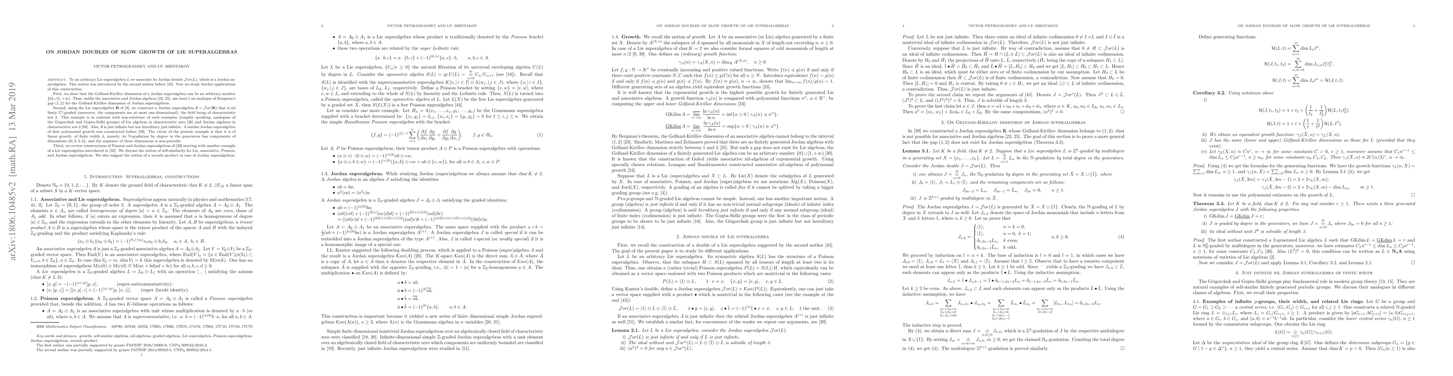 To an arbitrary Lie superalgebra $L$ we associate its Jordan double ${\mathcal Jor}(L)$, which is a Jordan superalgebra. This notion was introduced by the second author before. Now we study further applications of this construction. First, we show that the Gelfand-Kirillov dimension of a Jordan superalgebra can be an arbitrary number $\{0\}\cup [1,+\infty]$. Thus, unlike associative and Jordan algebras, one hasn't an analogue of Bergman's gap $(1,2)$ for the Gelfand-Kirillov dimension of Jordan superalgebras. Second, using the Lie superalgebra $\mathbf R$ constructed before, we construct a Jordan superalgebra $\mathbf J={\mathcal Jor}({\mathbf R})$ that is nil finely $\mathbb Z^3$-graded, in contrast with non-existence of such examples (roughly speaking, analogues of the Grigorchuk and Gupta-Sidki groups) of Lie algebras in characteristic zero and Jordan algebras in characteristic not 2. Also, $\mathbf J$ is just infinite but not hereditary just infinite. A similar Jordan superalgebra of slow polynomial growth was constructed before. The virtue of the present example is that it is of linear growth, of finite width 4, namely, its $\mathbb N$-gradation by degree in the generators has components of dimensions $\{0,2,3,4\}$, and the sequence of these dimensions is non-periodic. Third, we review constructions of Poisson and Jordan superalgebras starting with another example of a Lie superalgebra. We discuss the notion of self-similarity for Lie, associative, Poisson, and Jordan superalgebras. We also discuss the notion of a wreath product in case of Jordan superalgebras.