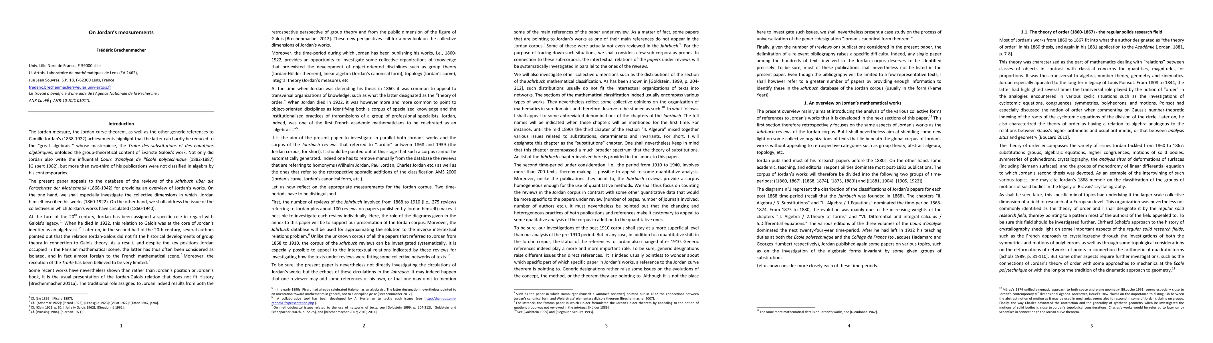 The Jordan measure, the Jordan curve theorem, as well as the other generic references to Camille Jordan's (1838-1922) achievements highlight that the latter can hardly be reduced to the "great algebraist" whose masterpiece, the Trait\'e des substitutions et des equations alg\'ebriques, unfolded the group-theoretical content of \'Evariste Galois's work. The present paper appeals to the database of the reviews of the Jahrbuch \"uber die Fortschritte der Mathematik (1868-1942) for providing an overview of Jordan's works. On the one hand, we shall especially investigate the collective dimensions in which Jordan himself inscribed his works (1860-1922). On the other hand, we shall address the issue of the collectives in which Jordan's works have circulated (1860-1940). Moreover, the time-period during which Jordan has been publishing his works, i.e., 1860-1922, provides an opportunity to investigate some collective organizations of knowledge that pre-existed the development of object-oriented disciplines such as group theory (Jordan-H\"older theorem), linear algebra (Jordan's canonical form), topology (Jordan's curve), integral theory (Jordan's measure), etc. At the time when Jordan was defending his thesis in 1860, it was common to appeal to transversal organizations of knowledge, such as what the latter designated as the "theory of order." When Jordan died in 1922, it was however more and more common to point to object-oriented disciplines as identifying both a corpus of specialized knowledge and the institutionalized practices of transmissions of a group of professional specialists.
