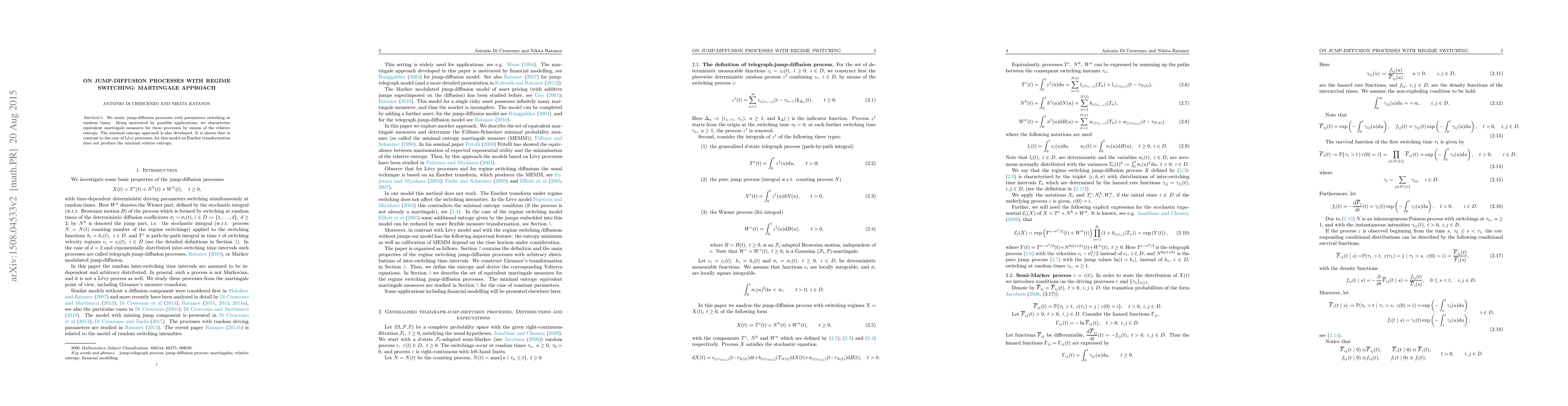 We study jump-diffusion processes with parameters switching at random times. Being motivated by possible applications, we characterise equivalent martingale measures for these processes by means of the relative entropy. The minimal entropy approach is also developed. It is shown that in contrast to the case of L\'evy processes, for this model an Esscher transformation does not produce the minimal relative entropy.