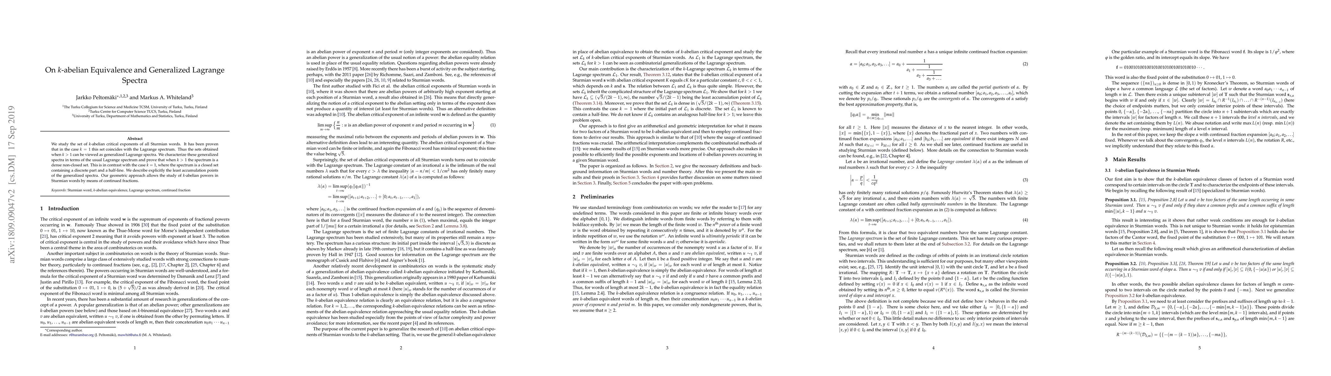 We study the set of $k$-abelian critical exponents of all Sturmian words. It has been proven that in the case $k = 1$ this set coincides with the Lagrange spectrum. Thus the sets obtained when $k > 1$ can be viewed as generalized Lagrange spectra. We characterize these generalized spectra in terms of the usual Lagrange spectrum and prove that when $k > 1$ the spectrum is a dense non-closed set. This is in contrast with the case $k = 1$, where the spectrum is a closed set containing a discrete part and a half-line. We describe explicitly the least accumulation points of the generalized spectra. Our geometric approach allows the study of $k$-abelian powers in Sturmian words by means of continued fractions.