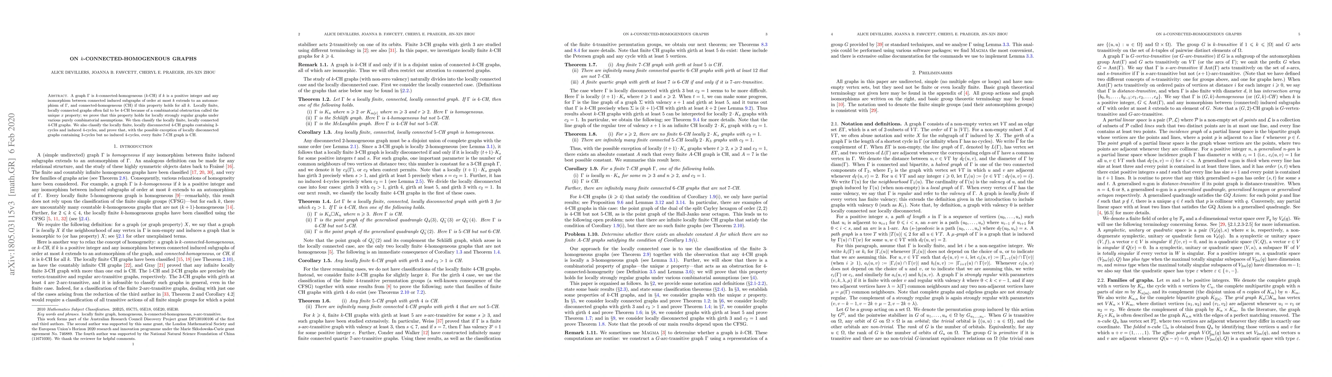 This paper explores $k$-connected-homogeneous graphs, proving that locally strongly regular graphs satisfy the unique $x$ property under combinatorial assumptions. It classifies locally finite, locally connected 4-CH graphs and those locally finite, locally disconnected 4-CH graphs containing 3-cycles and induced 4-cycles, concluding that every finite 7-CH graph is CH, except possibly for certain locally disconnected cases.