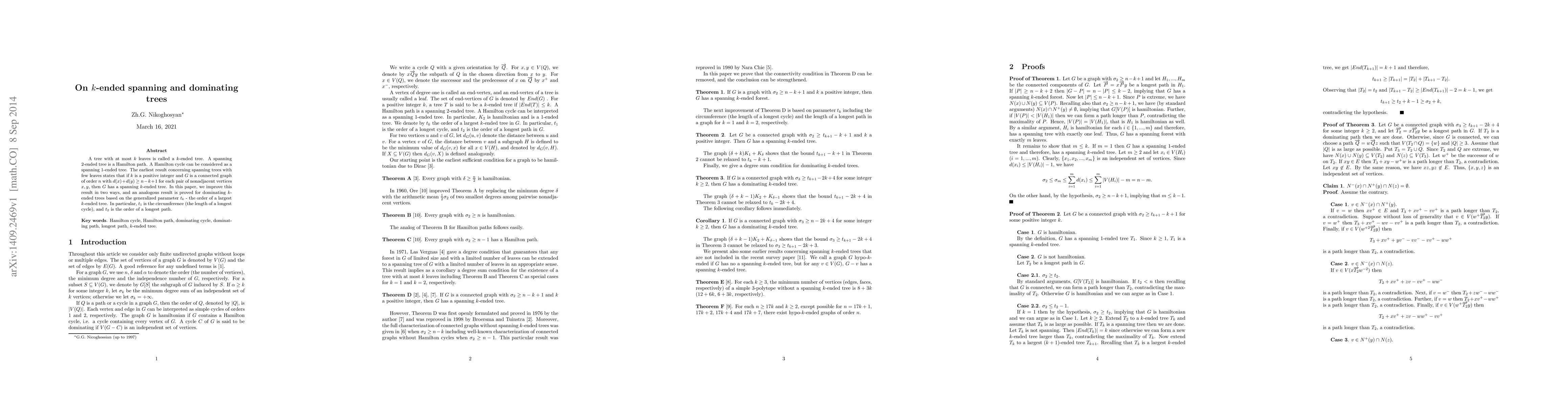 A tree with at most $k$ leaves is called a $k$-ended tree. A spanning 2-ended tree is a Hamilton path. A Hamilton cycle can be considered as a spanning 1-ended tree. The earliest result concerning spanning trees with few leaves states that if $k$ is a positive integer and $G$ is a connected graph of order $n$ with $d(x)+d(y)\ge n-k+1$ for each pair of nonadjacent vertices $x,y$, then $G$ has a spanning $k$-ended tree. In this paper, we improve this result in two ways, and an analogous result is proved for dominating $k$-ended trees based on the generalized parameter $t_k$ - the order of a largest $k$-ended tree. In particular, $t_1$ is the circumference (the length of a longest cycle), and $t_2$ is the order of a longest path.