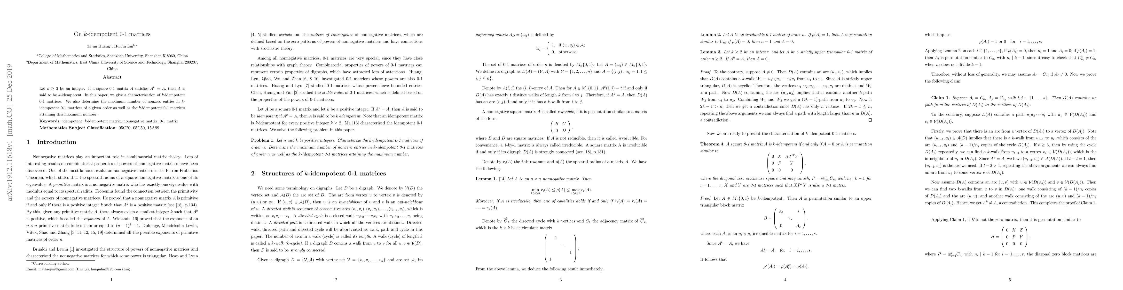This paper characterizes $k$-idempotent 0-1 matrices, which satisfy $A^k=A$, and determines the maximum number of nonzero entries in such matrices of a given order along with identifying those matrices achieving this maximum.