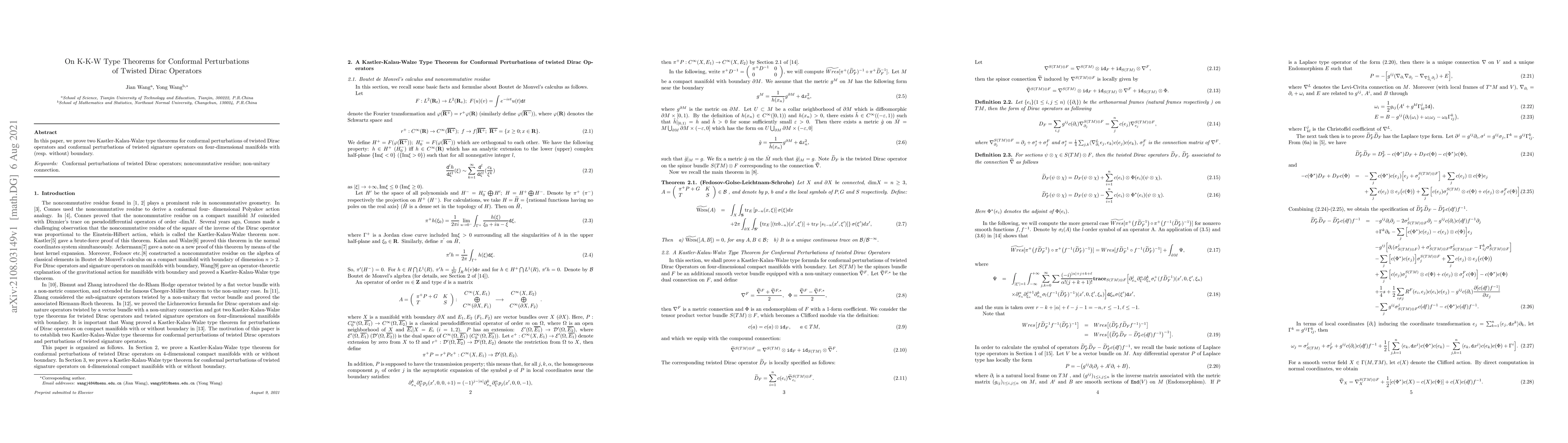 This paper proves two Kastler-Kalau-Walze type theorems concerning conformal perturbations of twisted Dirac and signature operators in four-dimensional manifolds, with and without boundaries. The results provide insights into the behavior of these operators under conformal changes.