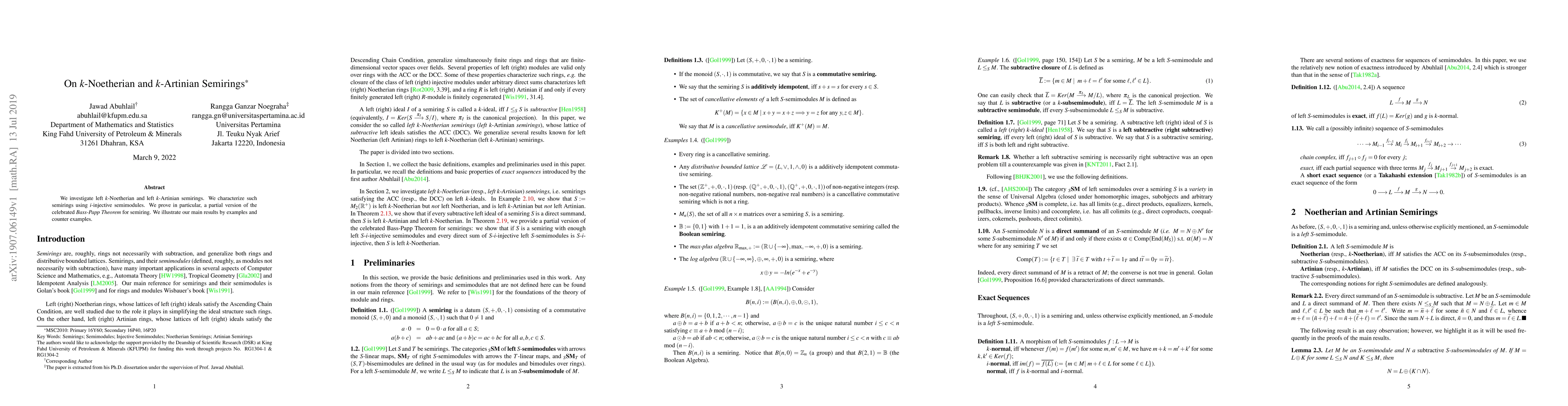 The paper investigates left k-Noetherian and left k-Artinian semirings, characterizing them using i-injective semimodules. It proves a partial version of the Bass-Papp Theorem for semirings and illustrates the main results with examples and counterexamples.