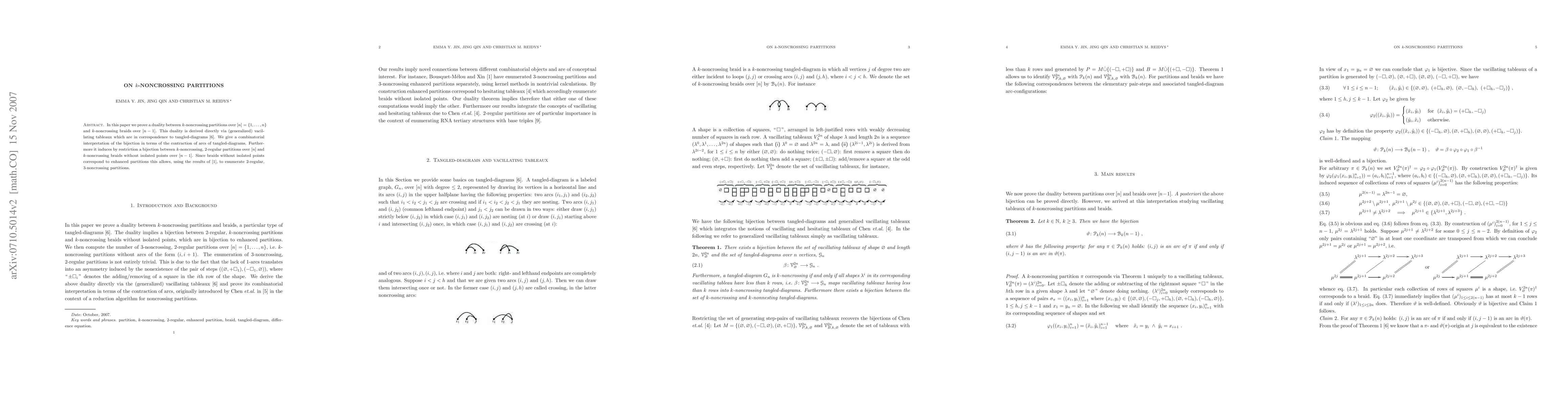 In this paper we prove a duality between $k$-noncrossing partitions over $[n]=\{1,...,n\}$ and $k$-noncrossing braids over $[n-1]$. This duality is derived directly via (generalized) vacillating tableaux which are in correspondence to tangled-diagrams \cite{Reidys:07vac}. We give a combinatorial interpretation of the bijection in terms of the contraction of arcs of tangled-diagrams. Furthermore it induces by restriction a bijection between $k$-noncrossing, 2-regular partitions over $[n]$ and $k$-noncrossing braids without isolated points over $[n-1]$. Since braids without isolated points correspond to enhanced partitions this allows, using the results of \cite{MIRXIN}, to enumerate 2-regular, 3-noncrossing partitions.