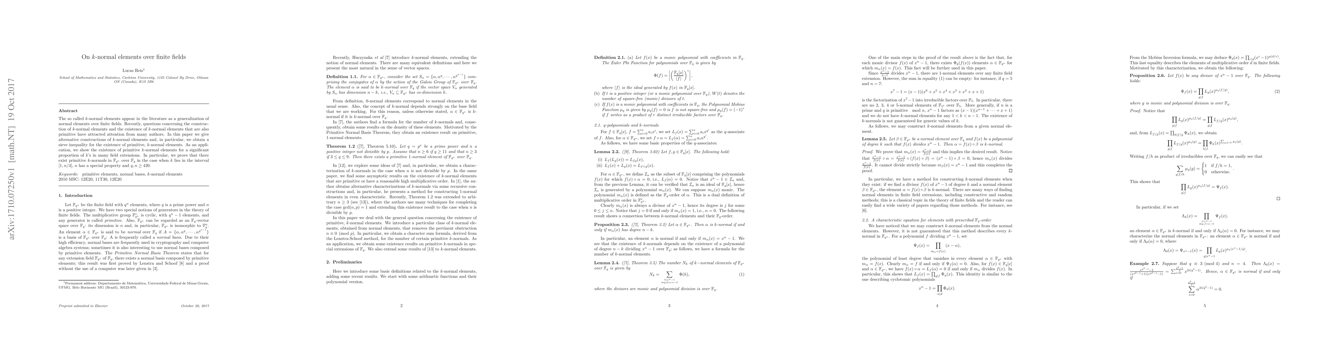 The so called $k$-normal elements appear in the literature as a generalization of normal elements over finite fields. Recently, questions concerning the construction of $k$-normal elements and the existence of $k$-normal elements that are also primitive have attracted attention from many authors. In this paper we give alternative constructions of $k$-normal elements and, in particular, we obtain a sieve inequality for the existence of primitive, $k$-normal elements. As an application, we show the existence of primitive $k$-normal elements for a significant proportion of $k$'s in many field extensions. In particular, we prove that there exist primitive $k$-normals in $\mathbb F_{q^n}$ over $\mathbb F_q$ in the case when $k$ lies in the interval $[1, n/4]$, $n$ has a special property and $q, n\ge 420$.