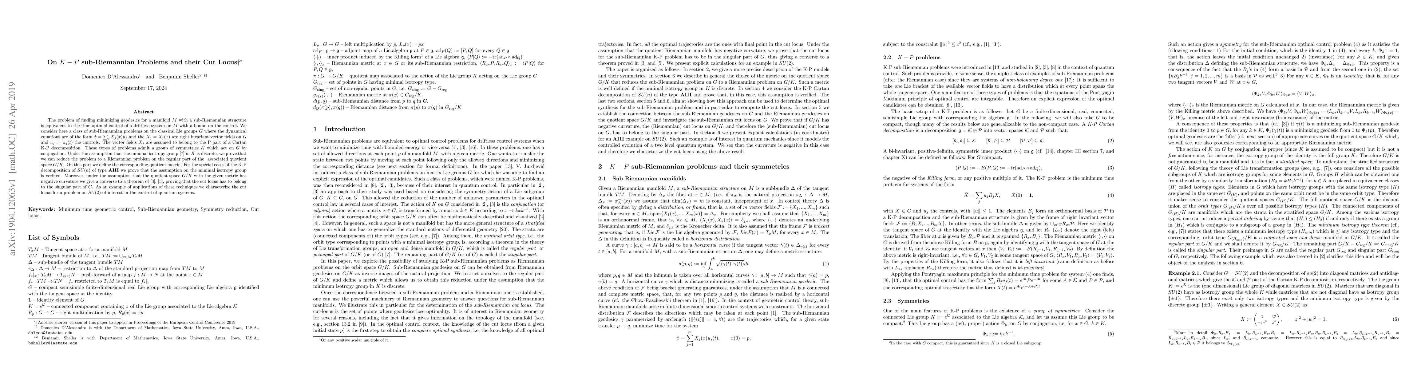 The problem of finding minimizing geodesics for a manifold M with a sub-Riemannian structure is equivalent to the time optimal control of a driftless system on M with a bound on the control. We consider here a class of sub-Riemannian problems on the classical Lie groups G where the dynamical equations are of the form \dot x=\sum_j X_j(x) u_j and the X_j=X_j(x) are right invariant vector fields on G and u_j:=u_j(t) the controls. The vector fields X_j are assumed to belong to the P part of a Cartan K-P decomposition. These types of problems admit a group of symmetries K which act on G by conjugation. Under the assumption that the minimal isotropy group in K is discrete, we prove that we can reduce the problem to a Riemannian problem on the regular part of the associated quotient space G/K. On this part we define the corresponding quotient metric. For the special cases of the K-P decomposition of SU(n) of type AIII we prove that the assumption on the minimal isotropy group is verified. Moreover, under the assumption that the quotient space G/K with the given metric has negative curvature we prove that the cut locus has to belong to the singular part of G. As an example of applications of these techniques we characterize the cut locus for a problem on SU(2) of interest in the control of quantum systems.