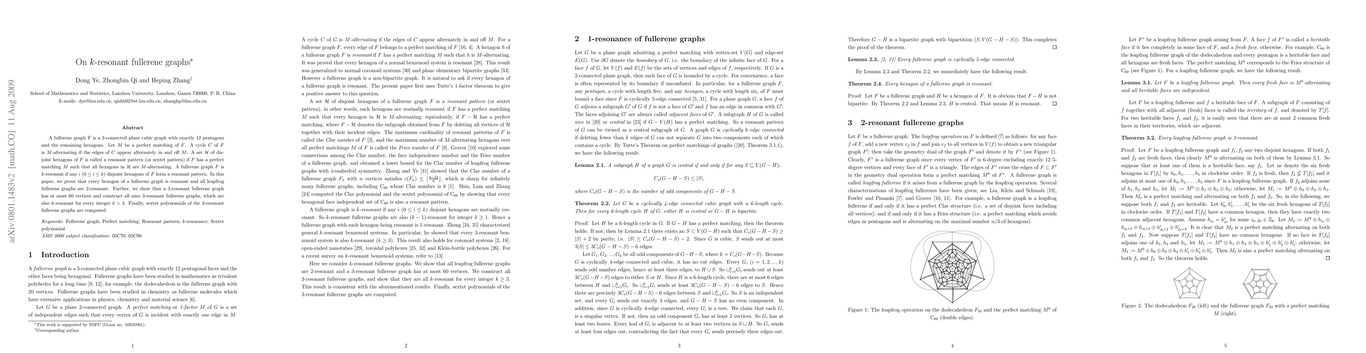 This paper investigates k-resonant fullerene graphs, proving that every hexagon is resonant and that all leapfrog fullerene graphs are 2-resonant. It further demonstrates that 3-resonant fullerene graphs have at most 60 vertices and constructs all nine such graphs, which are also k-resonant for k > 3, along with computing their sextet polynomials.