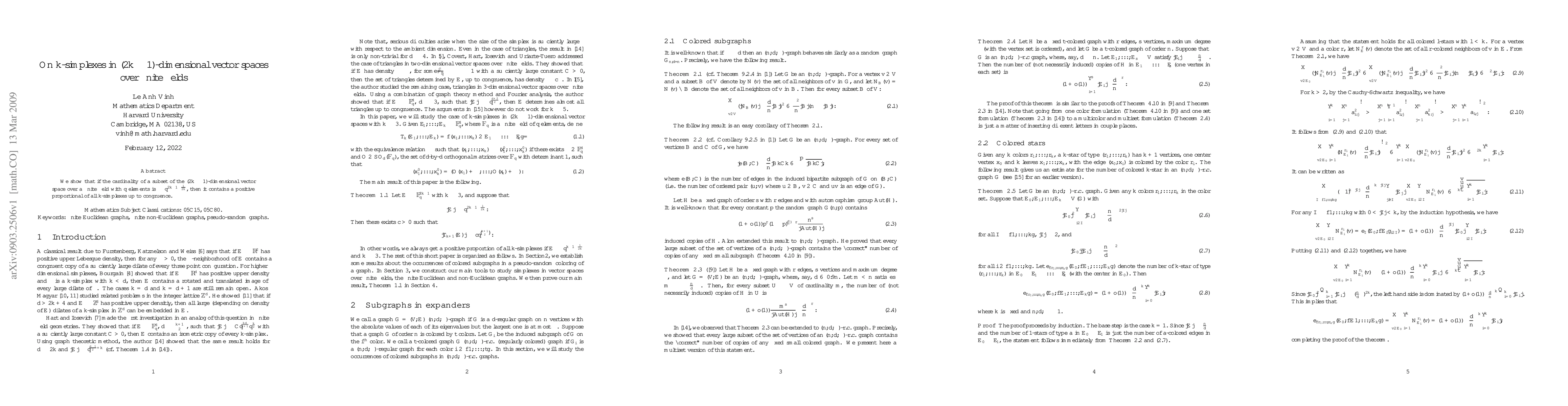 We show that if the cardinality of a subset of the $(2k-1)$-dimensional vector space over a finite field with $q$ elements is $\gg q^{2k-1-\frac{1}{2k}}$, then it contains a positive proportional of all $k$-simplexes up to congruence.