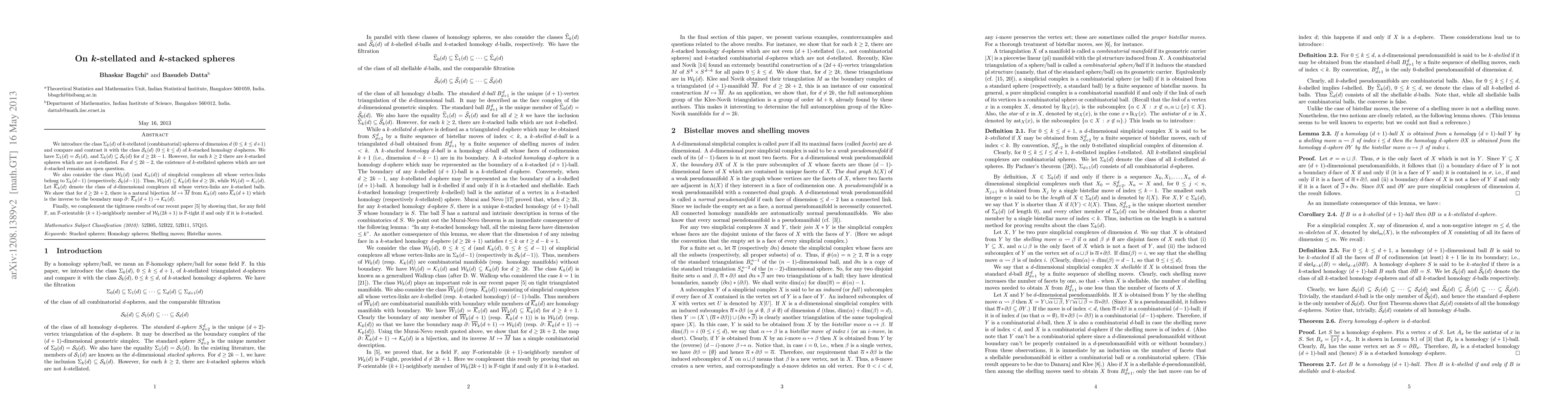 This paper introduces $k$-stellated and $k$-stacked spheres, comparing $\Sigma_k(d)$ and ${\cal S}_k(d)$ classes and showing $\Sigma_k(d)$ is a subset of ${\cal S}_k(d)$ for $d \geq 2k-1$, with some $k$-stacked spheres not being $k$-stellated for $k \geq 2$. It also explores classes ${\cal W}_k(d)$ and ${\cal K}_k(d)$ of simplicial complexes related to these sphere classes, establishing a bijection between ${\cal K}_k(d)$ and $\bar{{\cal K}}_k(d+1)$ for $d \geq 2k+2$.