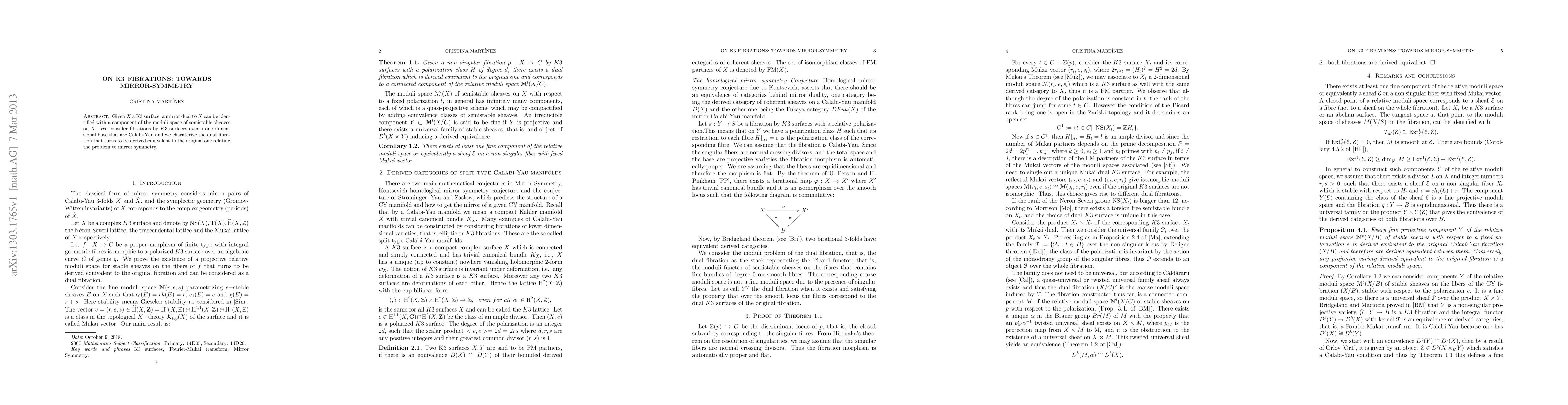 This paper explores K3 fibrations over a one-dimensional base, identifying their mirror duals in the moduli space of semistable sheaves. It characterizes the dual fibration derived equivalent to the original one, thus connecting the study to mirror symmetry.