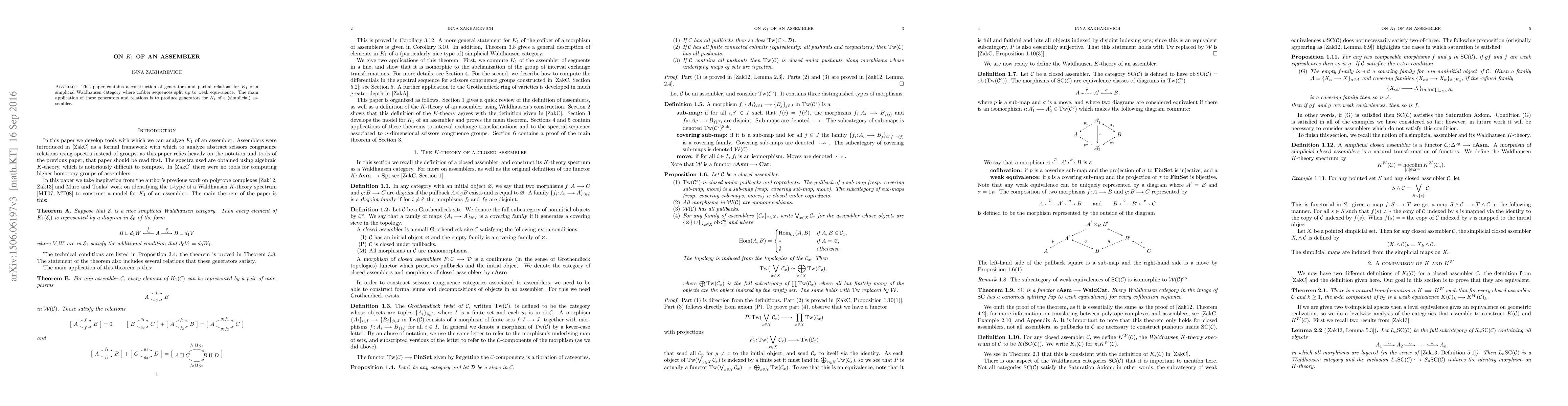 This paper contains a construction of generators and partial relations for $K_1$ of a simplicial Waldhausen category where cofiber sequences split up to weak equivalence. The main application of these generators and relations is to produce generators for $K_1$ of a (simplicial) assembler.