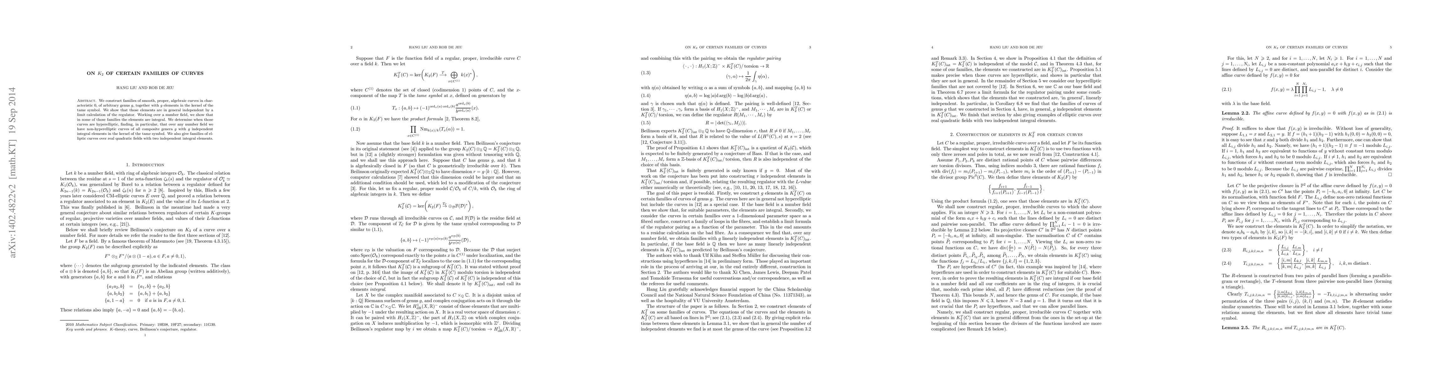 We construct families of smooth, proper, algebraic curves in characteristic 0, of arbitrary genus g, together with g elements in the kernel of the tame symbol. We show that those elements are in general independent by a limit calculation of the regulator. Working over a number field, we show that in some of those families the elements are integral. We determine when those curves are hyperelliptic, finding, in particular, that over any number field we have non-hyperelliptic curves of all composite genera g with g independent integral elements in the kernel of the tame symbol.