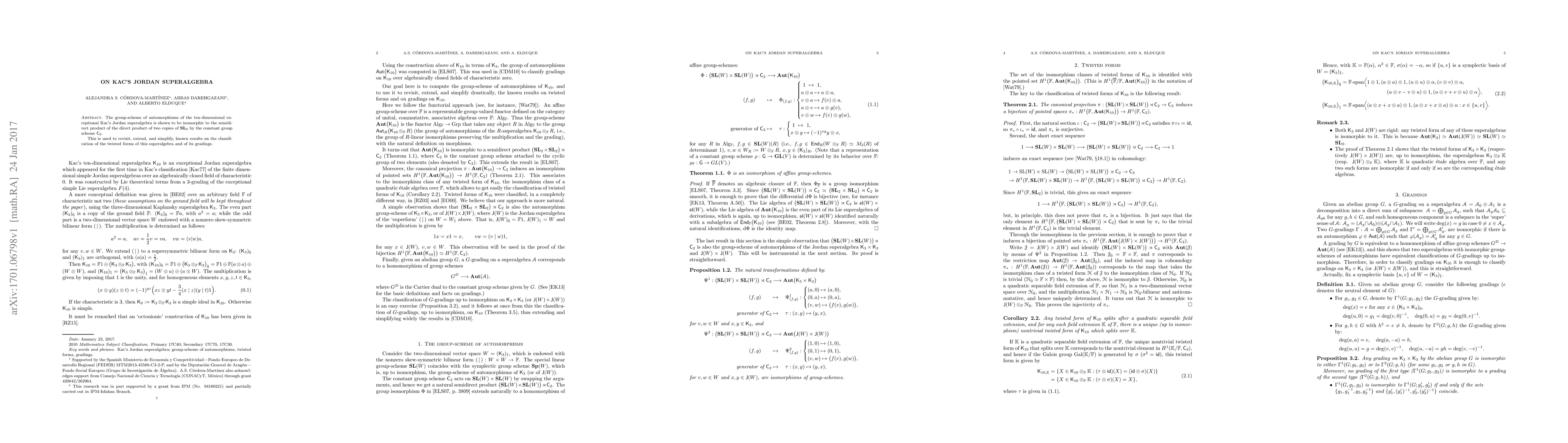 Summary: The paper demonstrates that the automorphism group-scheme of Kac's ten-dimensional exceptional Jordan superalgebra is isomorphic to a specific semidirect product, which simplifies the classification of its twisted forms and gradings. This result extends and refines existing knowledge in the field.