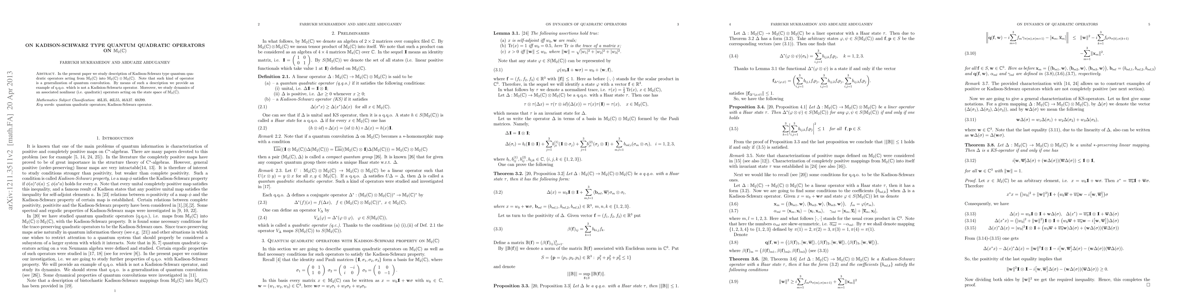 This paper explores Kadison-Schwarz type quantum quadratic operators on $\bm_2(\mathbb{C})$, generalizing quantum convolution, and provides an example of such an operator that does not satisfy the Kadison-Schwarz condition. It also examines the dynamics of associated nonlinear quadratic operators on the state space of $\bm_2(\mathbb{C})$.