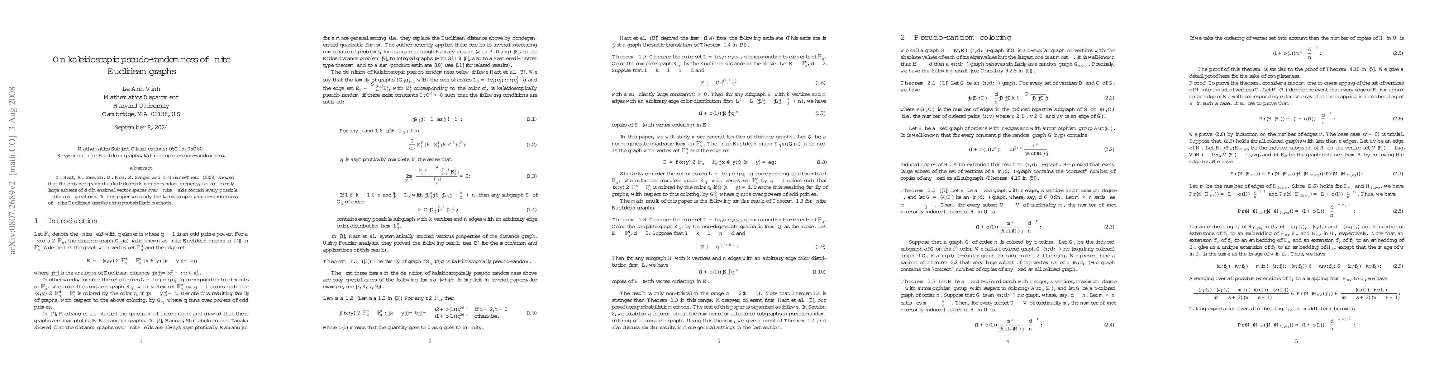 Summary: This paper investigates the kaleidoscopic pseudo-randomness of finite Euclidean graphs through probabilistic methods, demonstrating that large enough subsets of d-dimensional vector spaces over finite fields exhibit every possible finite configuration.