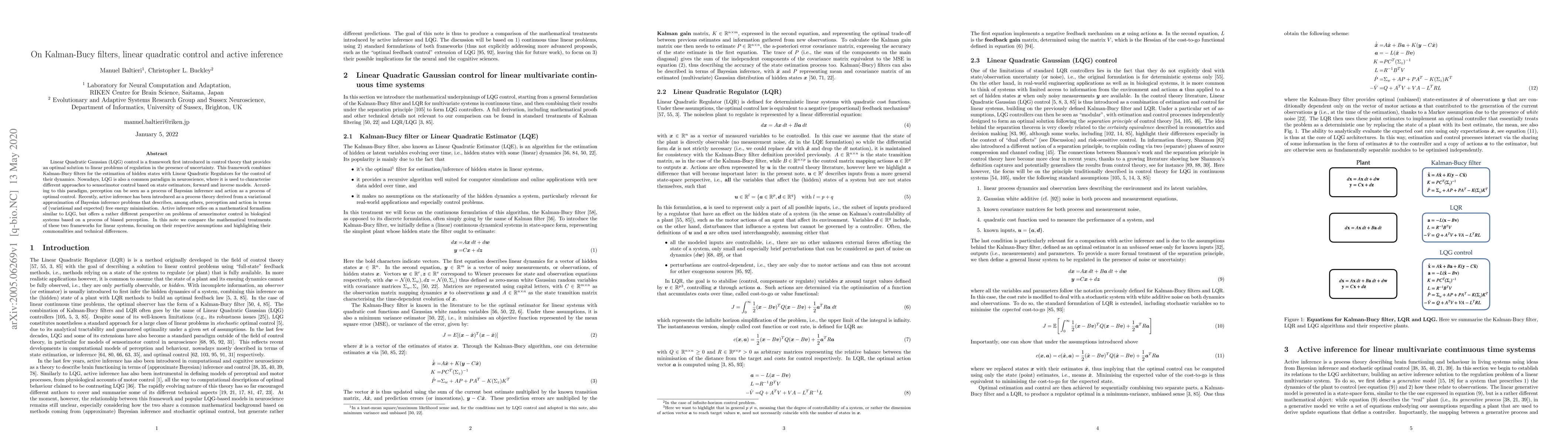 This paper compares Kalman-Bucy filters and Linear Quadratic Gaussian (LQG) control with active inference, highlighting their mathematical similarities and differences, and discussing their respective assumptions in the context of sensorimotor control and state estimation.